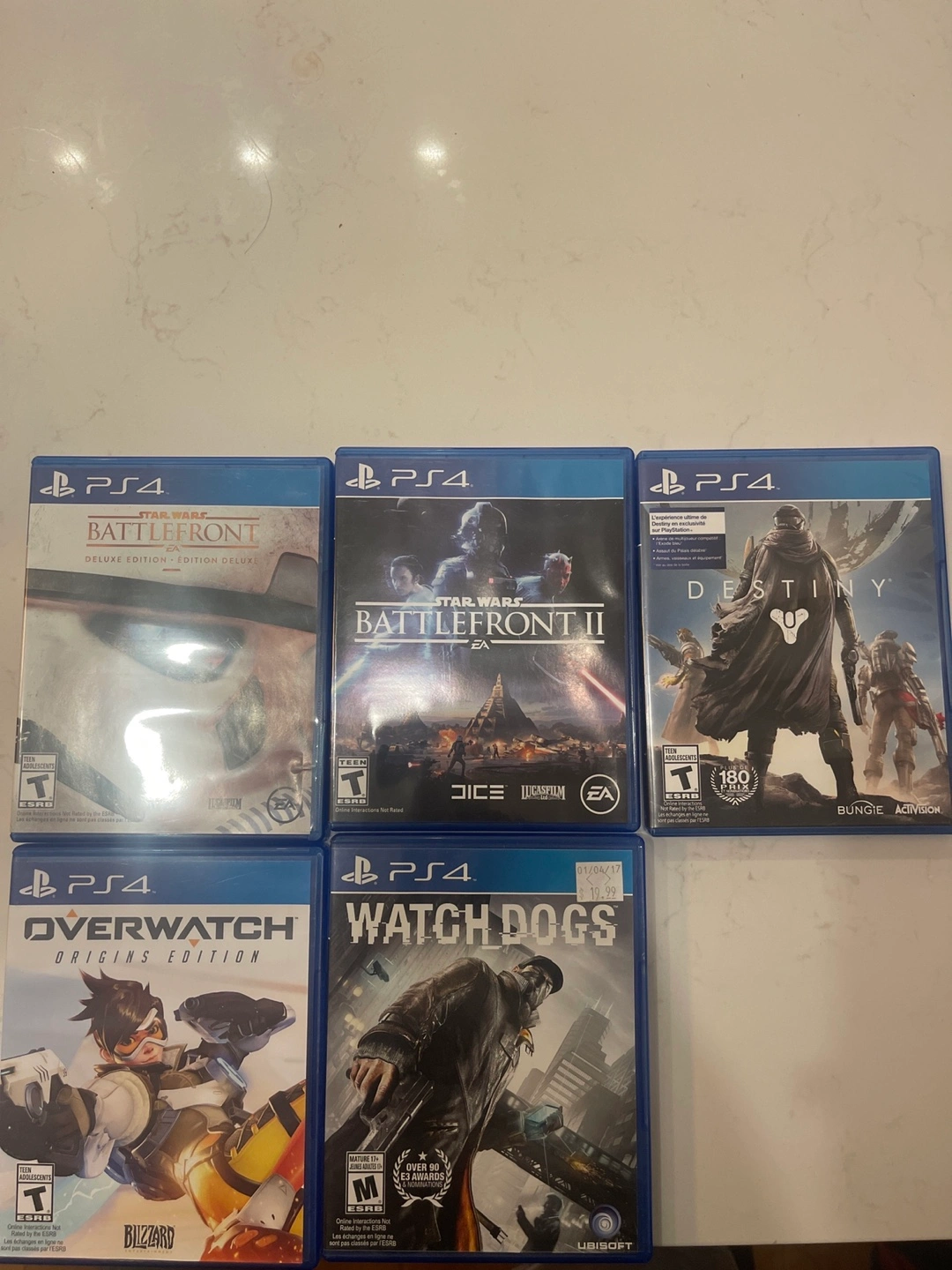126Bundle of five PlayStation 4 games. Includes Star Wars Battlefront II Deluxe Edition, Overwatch Origins Edition, Watch Dogs, and Destiny. Pre-owned, good condition.