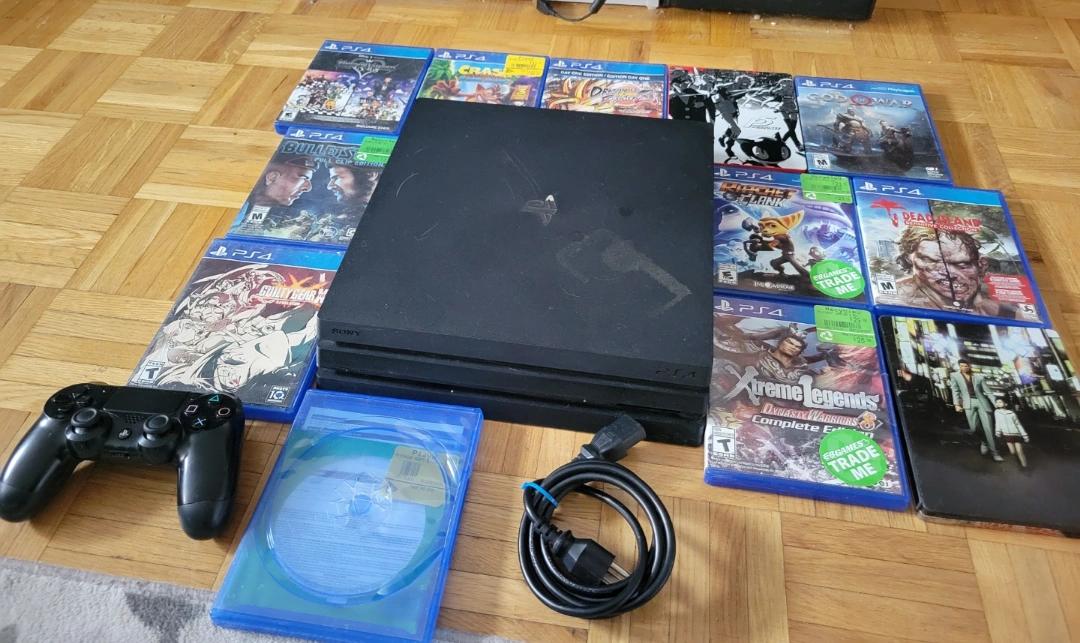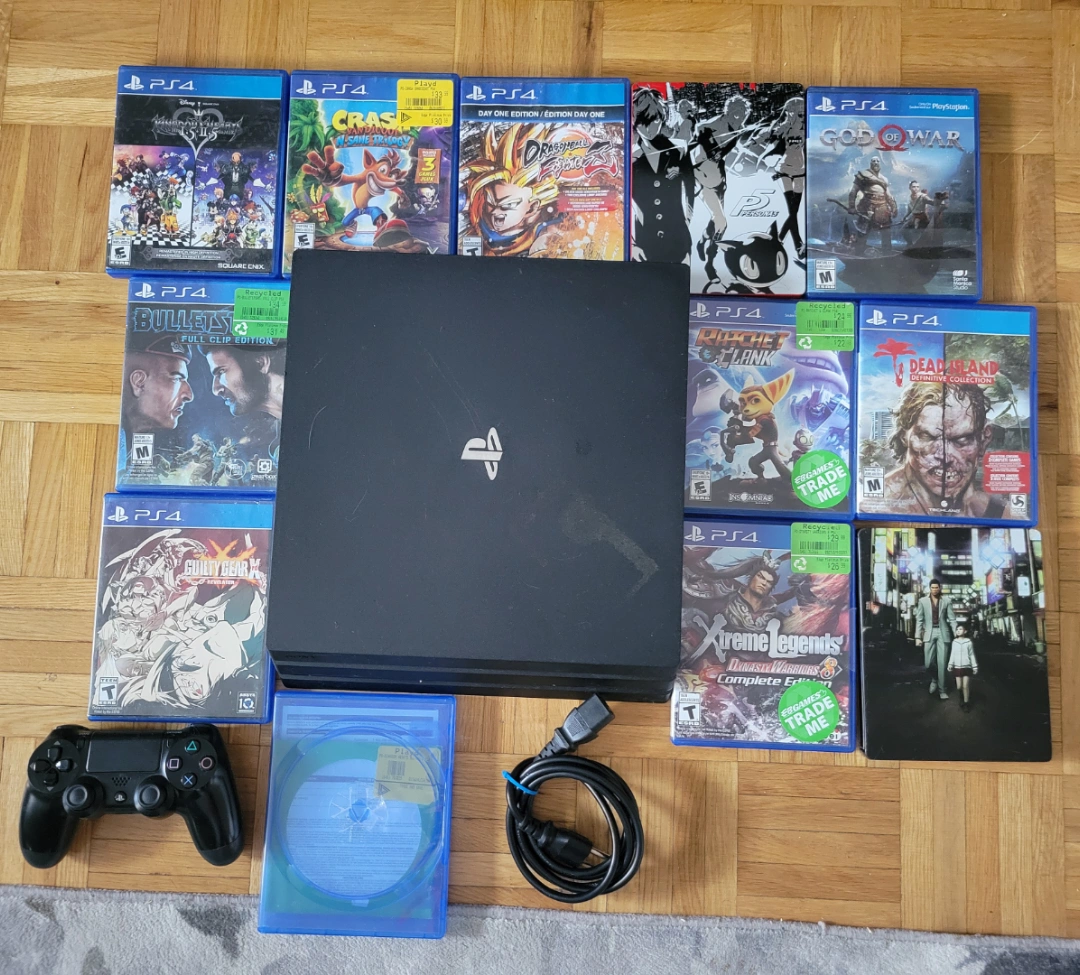 Sony PlayStation 4 Pro console. Includes one controller and twelve games. Power cord included. Pre-owned, some discoloration on the top as seen in photo, but it's much less noticeable in person. Games include all seen in image, as well as limited edition steelbook copies of Yakuza 0, Persona 5, and a coverless case containing Kingdom Hearts 2.8.
