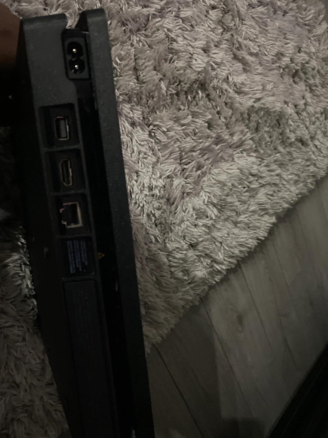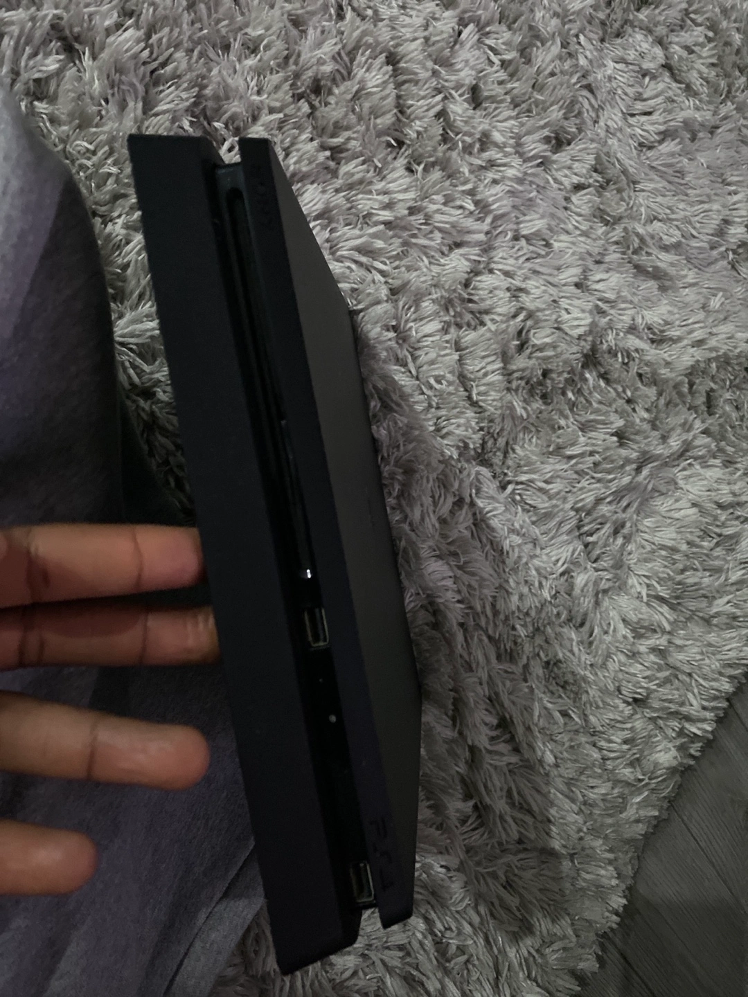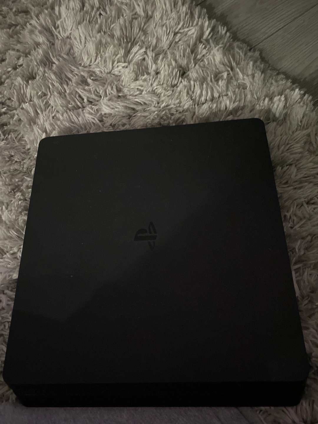 Black PS4 Slim console. Includes power cord and HDMI cable. Works perfectly. Comes with a Fifa disc