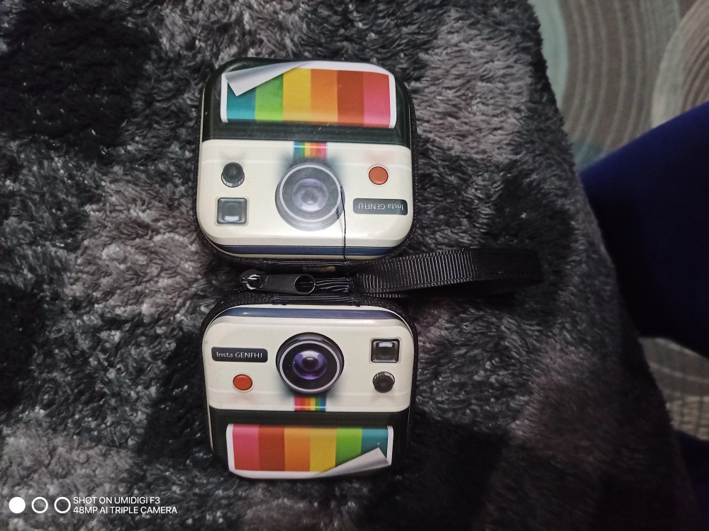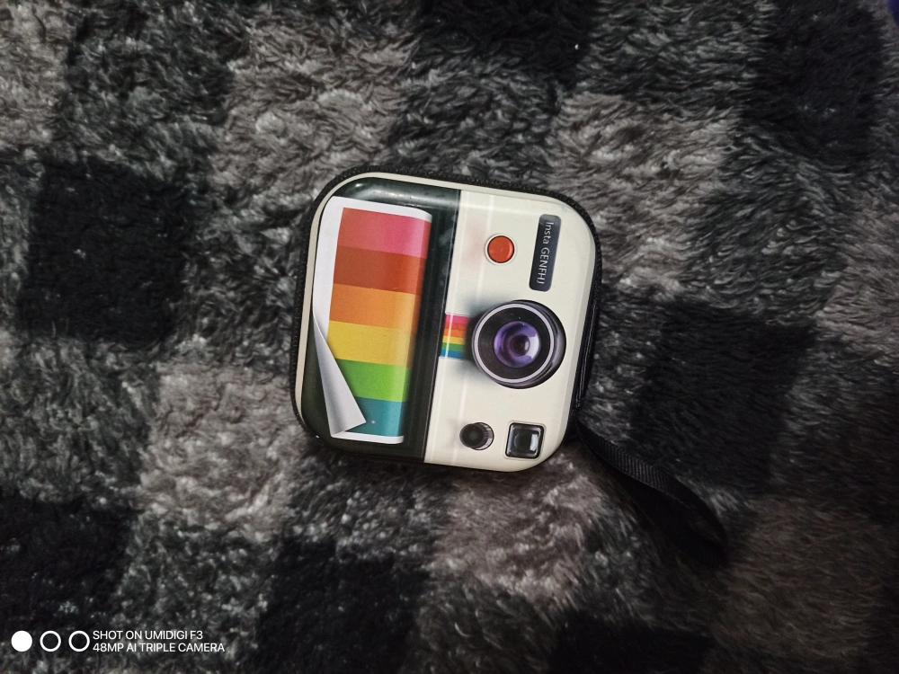 Pair of small, square zippered carrying cases. Features a retro Polaroid camera design. Black exterior, white interior. Small carrying handle. used to put small coins or earphones.DM to pick up