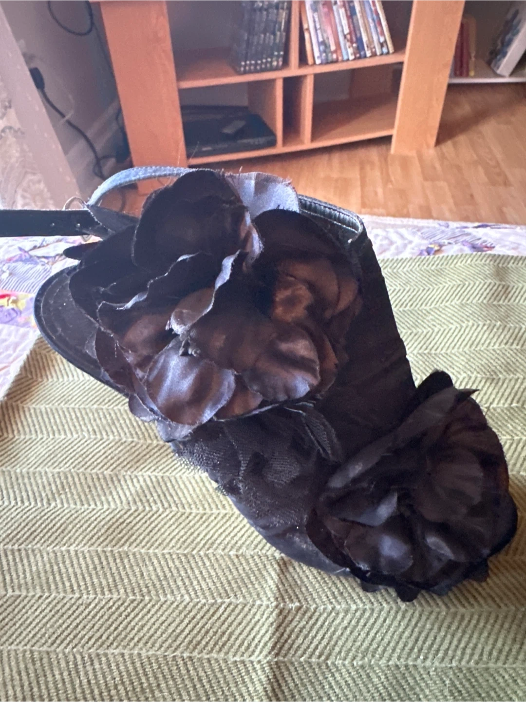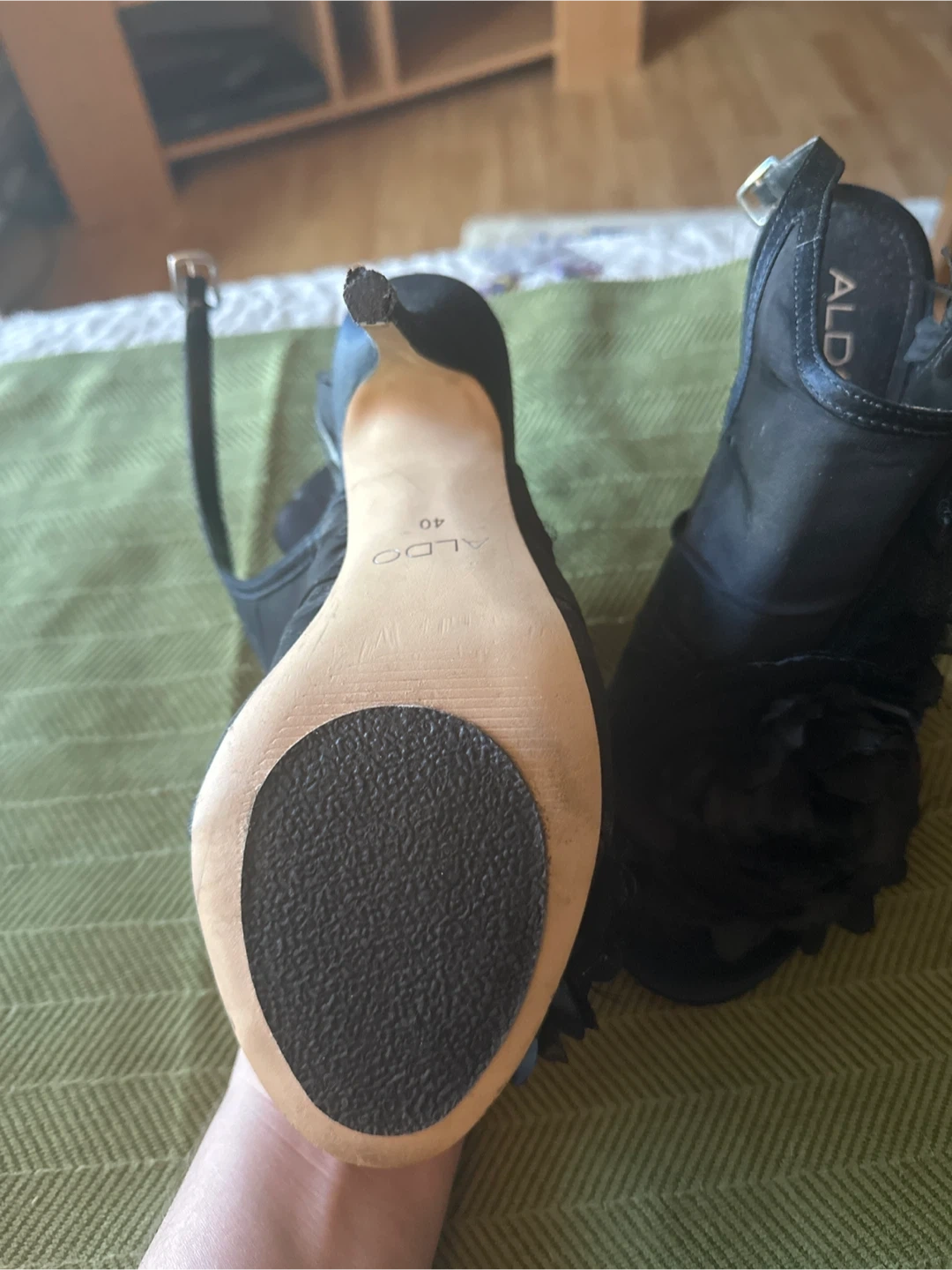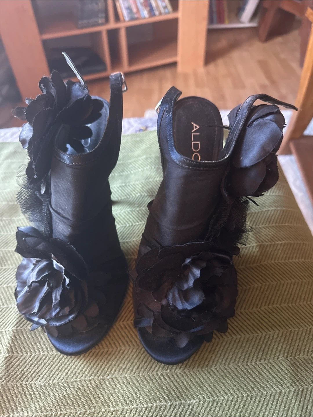These are stylish black ALDO high heel sandals. They feature decorative floral embellishments and an ankle strap for a secure fit. size 9/40. Perfect for dressing up an outfit for a special occasion!