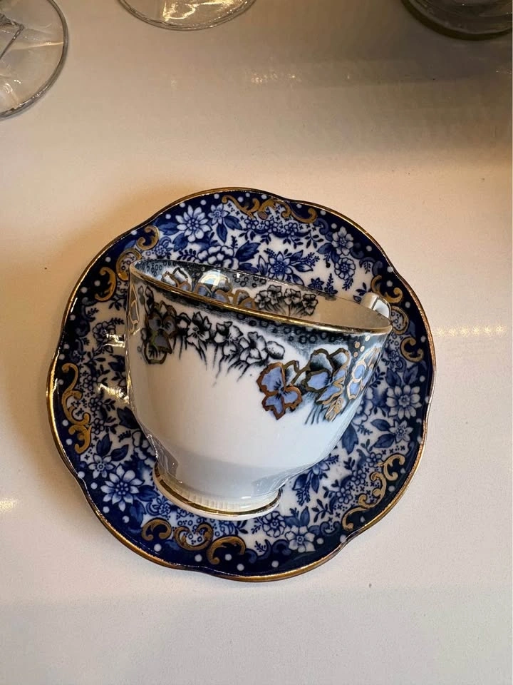 Elegant Court China teacup and saucer set. Has a beautiful blue and white floral pattern with gold trim. The cup has a delicate blue and gold floral design inside. Made in England.