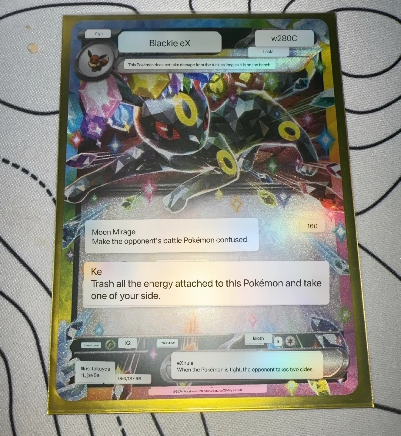 This is a Pokemon trading card featuring Blackie ex. It has a "Moon Mirage" attack that makes the opponent's Pokémon confused. The card has 280 HP.