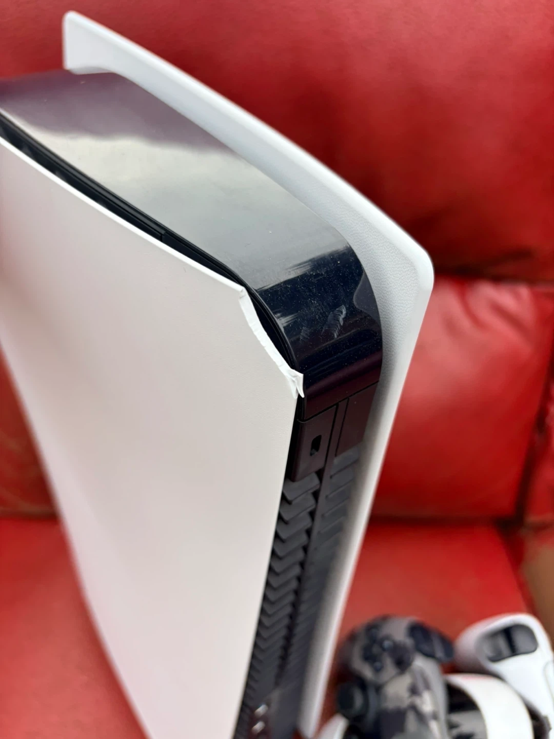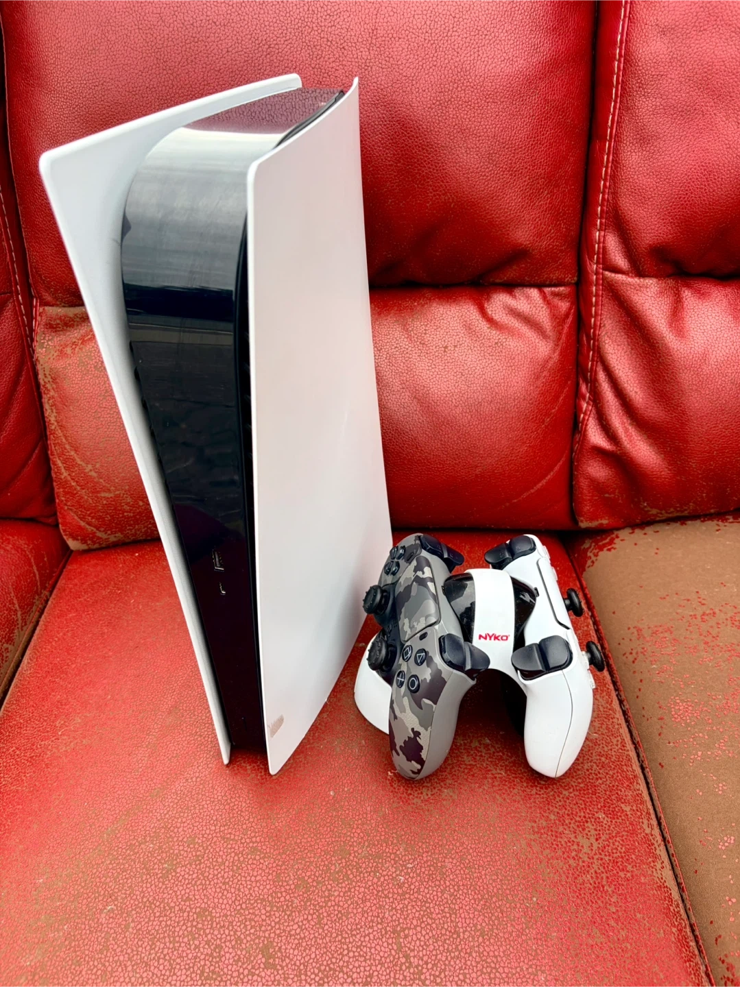 Ps5 digital with 2 controllers in good working condition. Comes with charging dock and needed cables. Right plate has small chip in corner as seen in photos and console has normal wear and tear, other then that works great. Firm price, pick up only.
