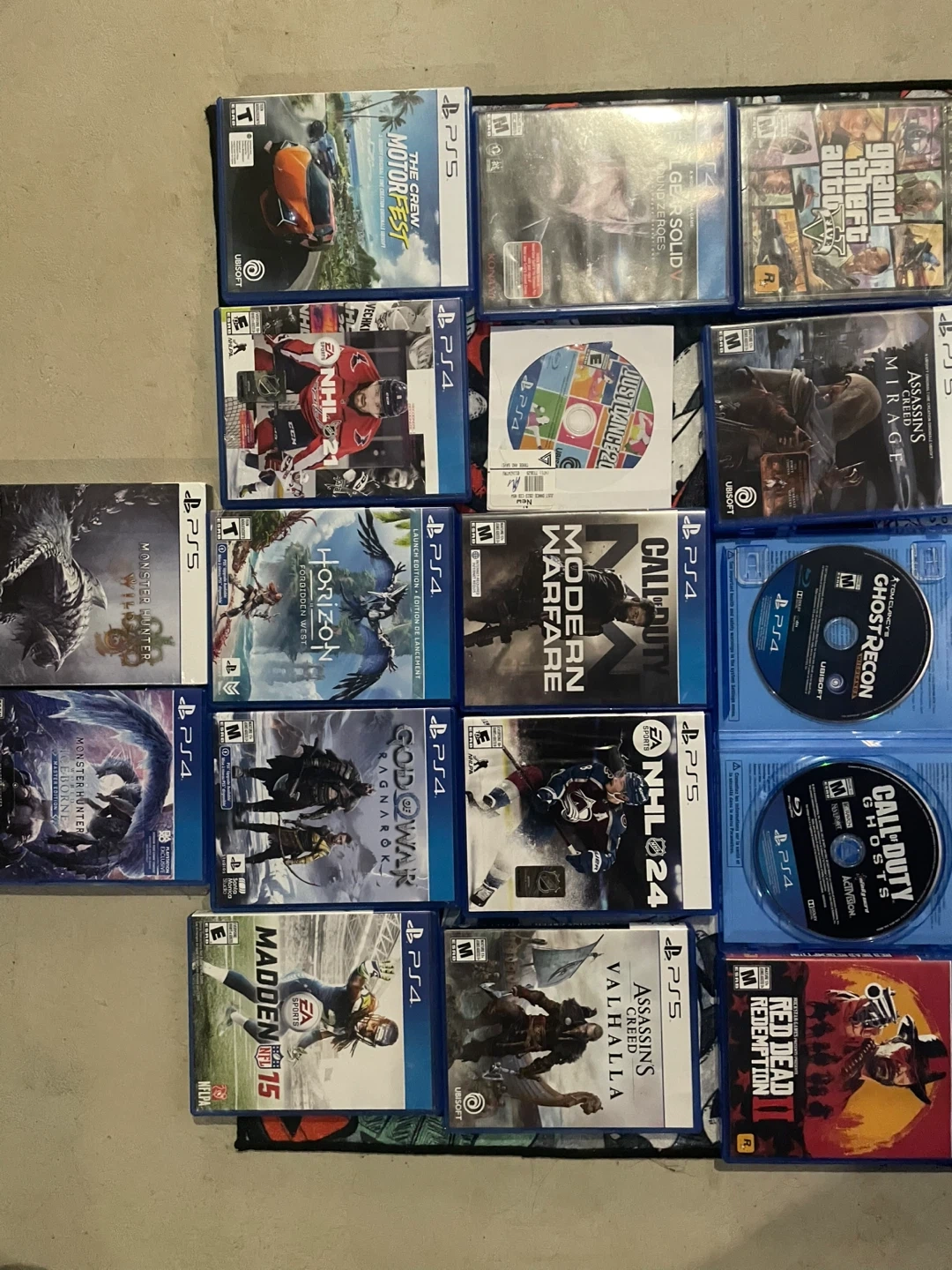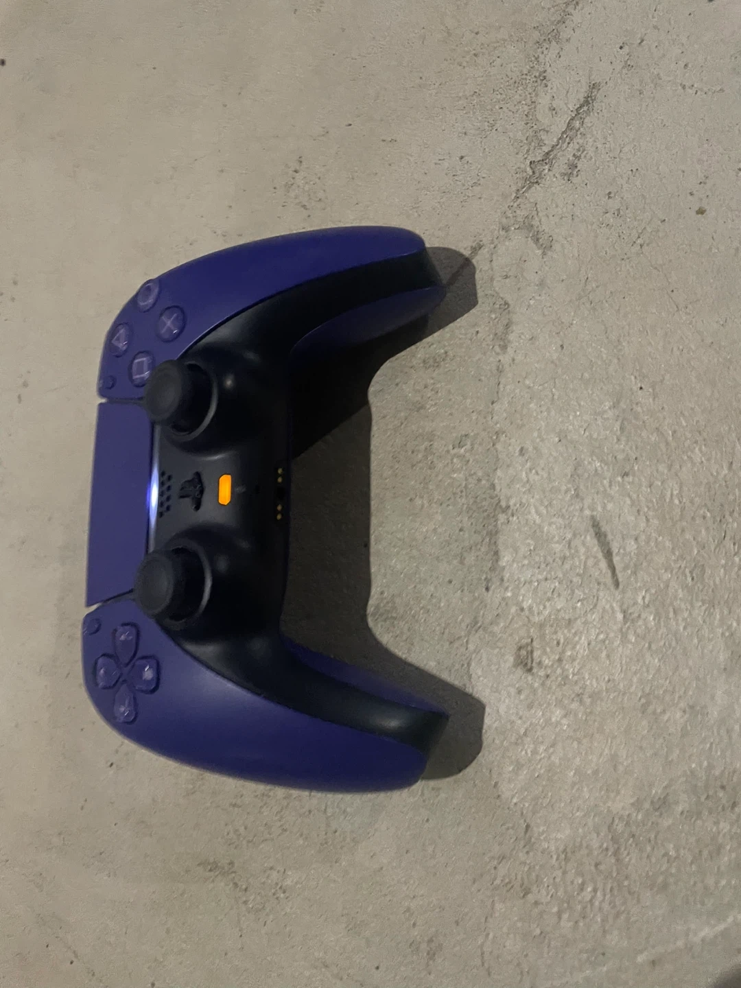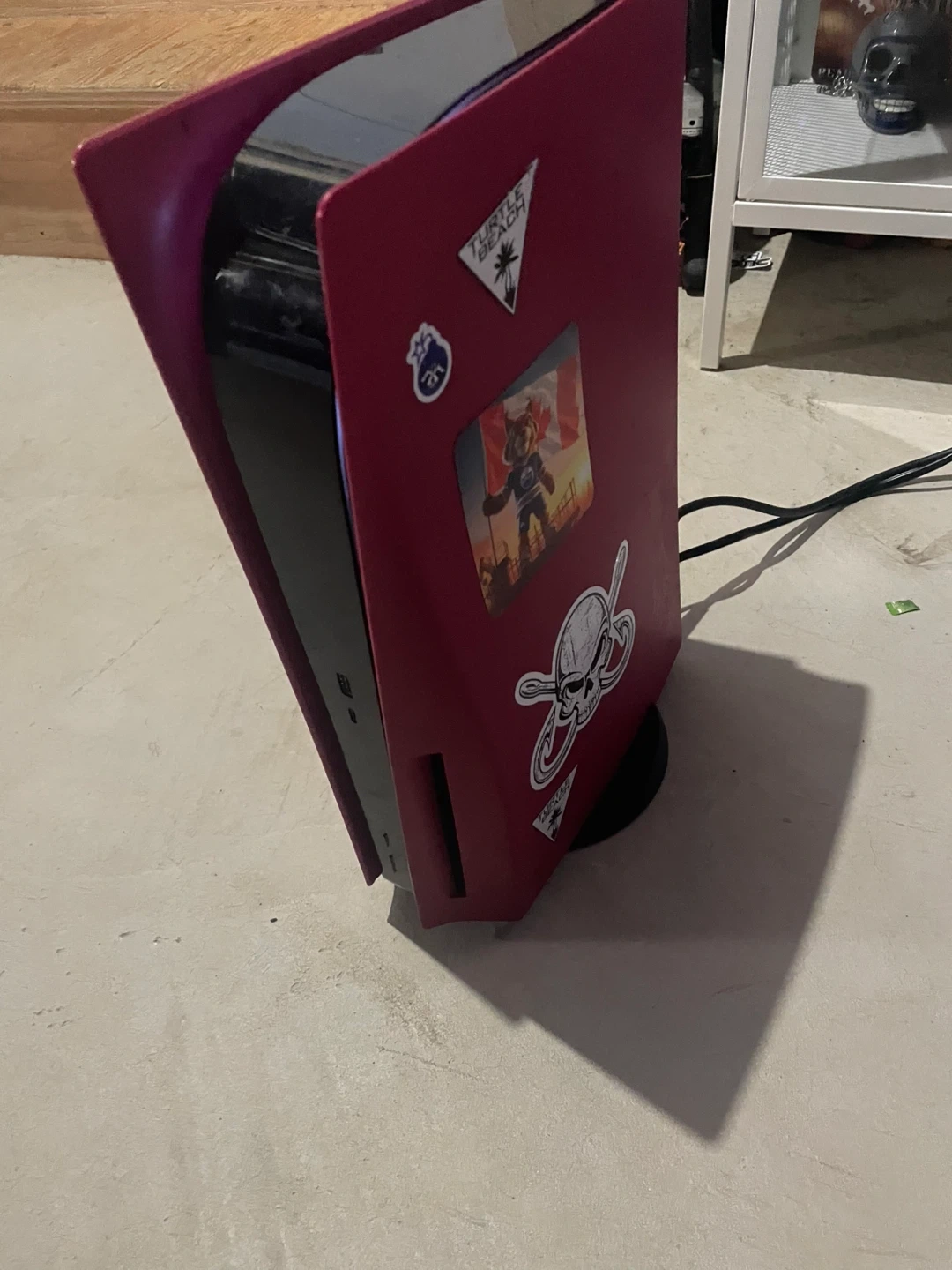 Selling a PlayStation 5 with a custom pinkish red plate. Includes a variety of games, a Turtle Beach headset, and a purple DualSense controller