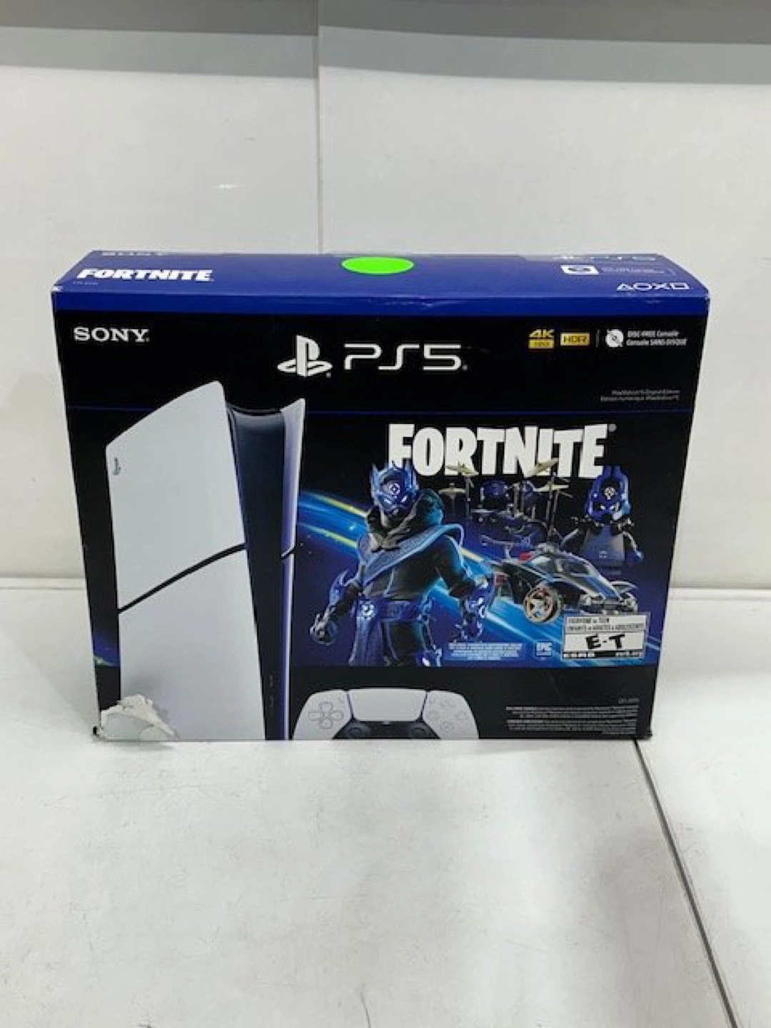 PlayStation 5 Digital Edition console. Fortnite bundle includes exclusive cosmetics. Comes with controller and cables. New condition.