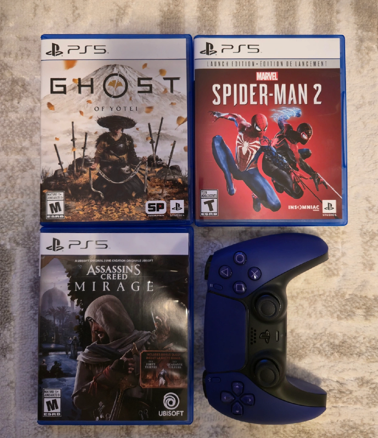 Selling a bundle of PS5 games and a controller! Includes: - Ghost of yotei - Marvel Spider-Man 2 Launch Edition - Assassin's Creed Mirage - Blue PS5 Controller