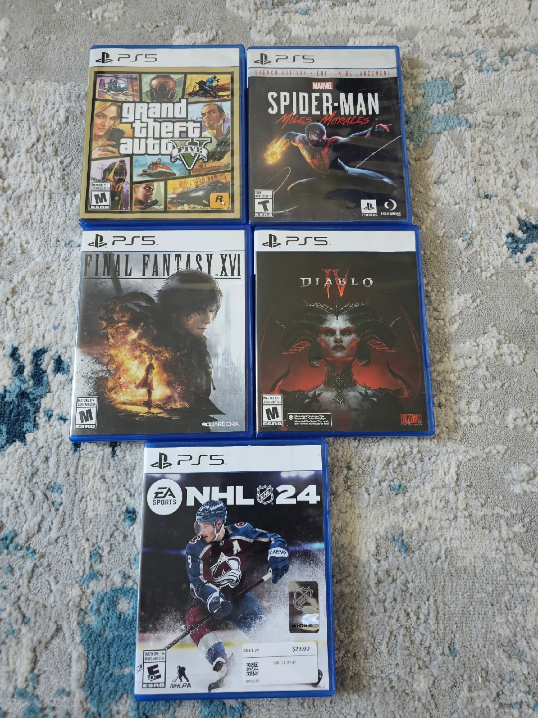 Selling a collection of PlayStation 5 games! Includes: - Grand Theft Auto V - Marvel Spider-Man Miles Morales - Final Fantasy XVI ---SOLD - Diablo IV - NHL 24 $30 EACH