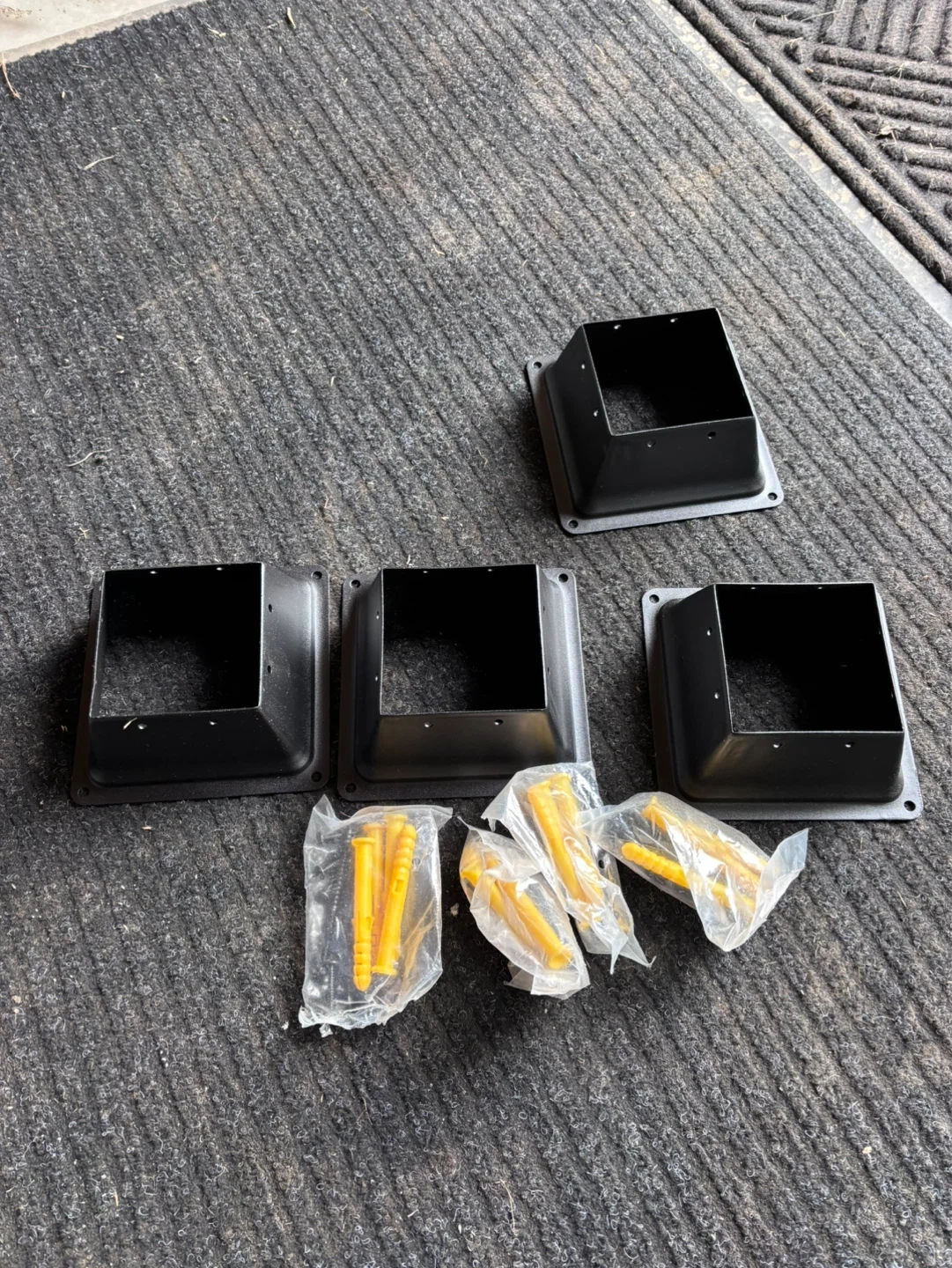 Brand new Four black square base mounts included, designed for sturdy installation. It comes with multiple yellow wall anchors for secure fastening. These are great for mounting outdoor fixtures or structural supports.