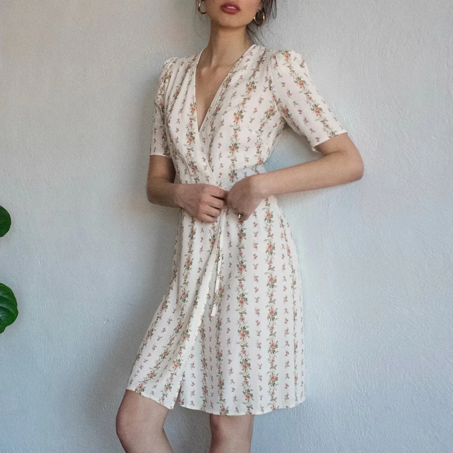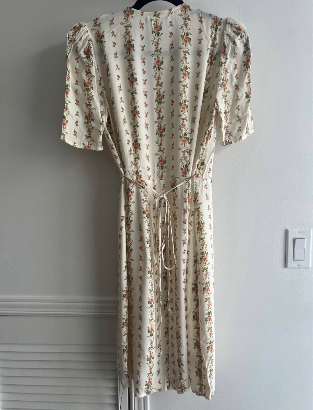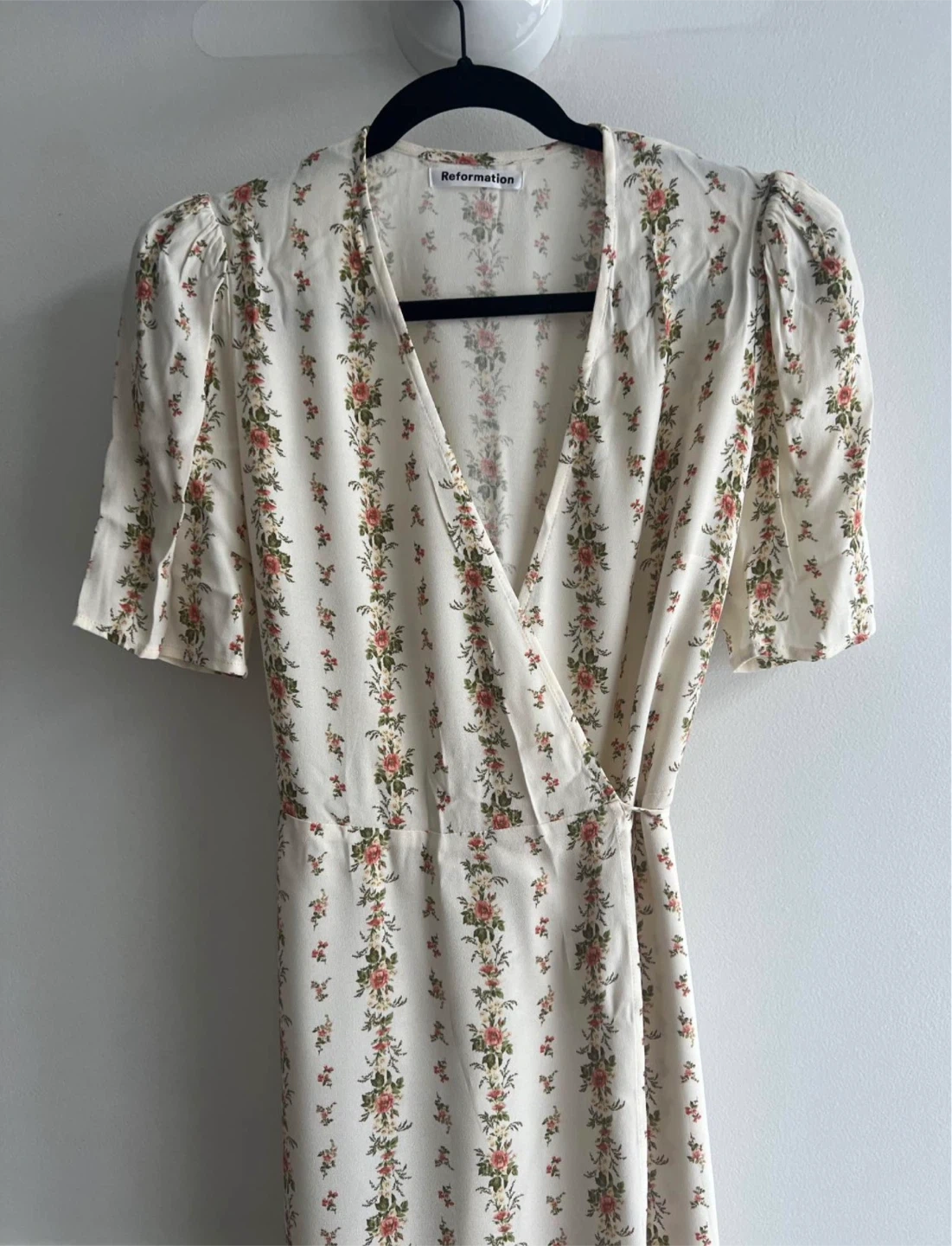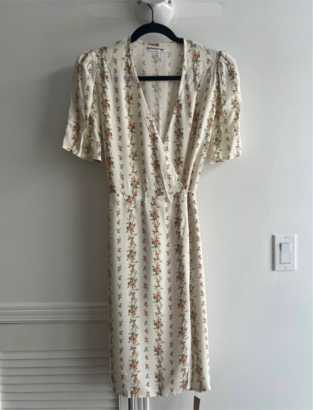 This is a gorgeous, functional wrap dress with a v neckline and structured shoulders for a more put together look. It has an adjustable waist tie so you can fit it to your liking.