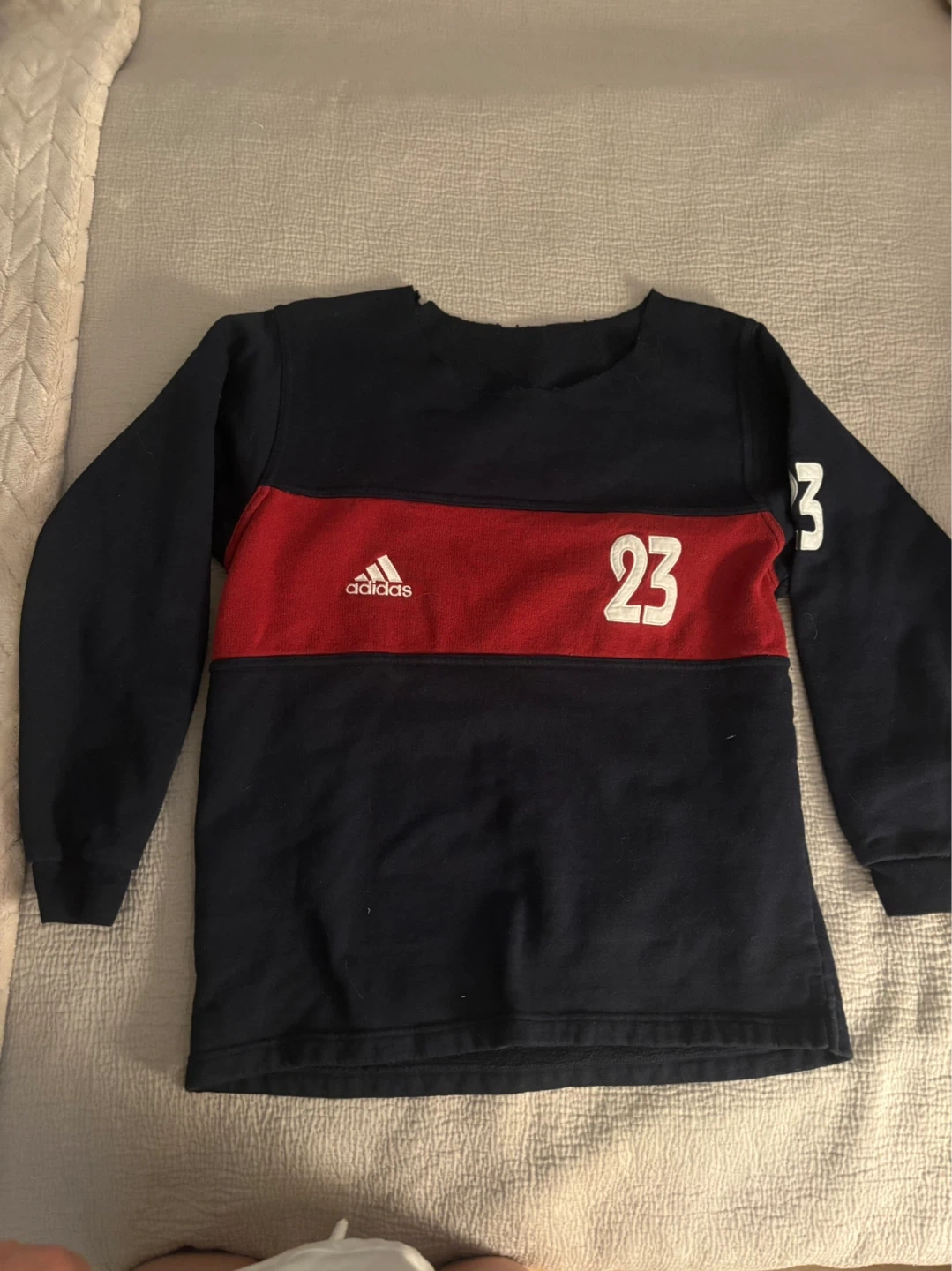Navy and red Adidas sweatshirt with number 23 on the front. Long sleeves and crew neck. Cotton blend material. Has been cut head hole was too small.