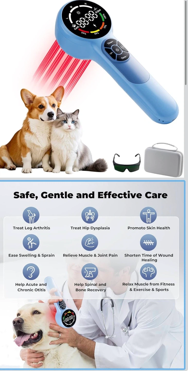 This device offers safe, non-invasive therapy for a variety of ailments in pets and humans. It's portable, rechargeable with a 5200mAh battery, and includes adjustable power levels and modes. Comes with protective glasses, magnetic cover, charging adapter, and a travel case.