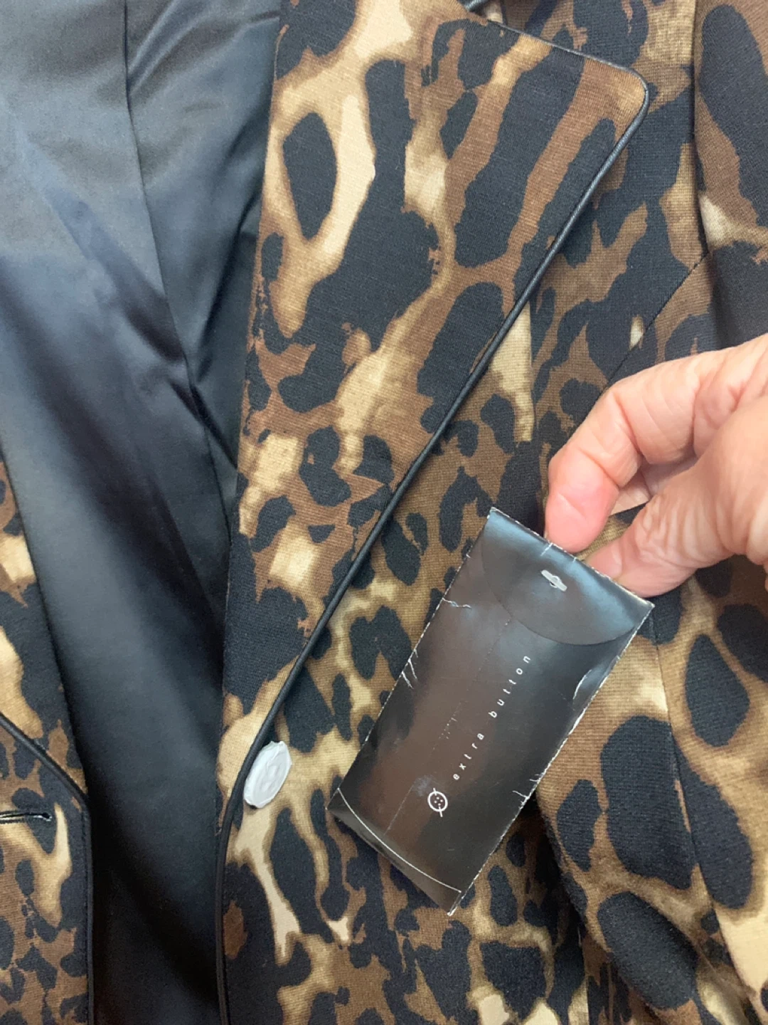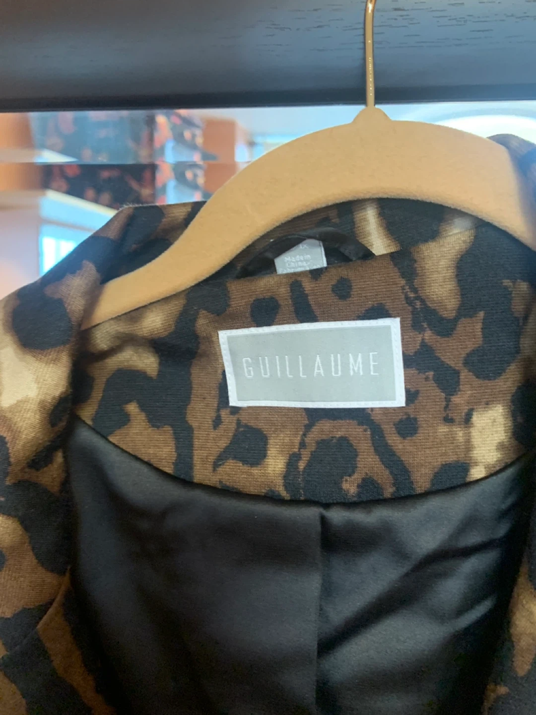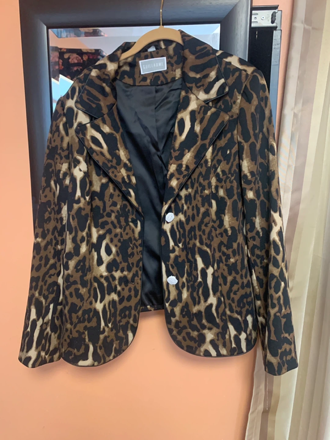 Stylish Guillaume blazer with a bold leopard print. It's fully lined and features two front buttons. Includes an extra button attached inside.