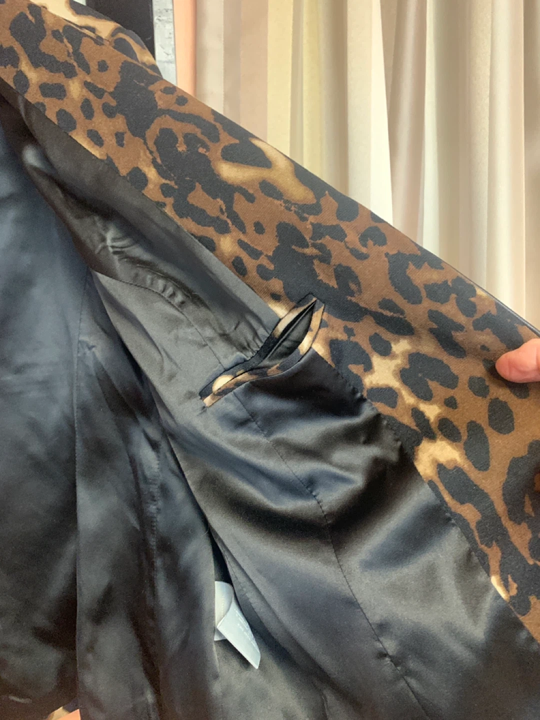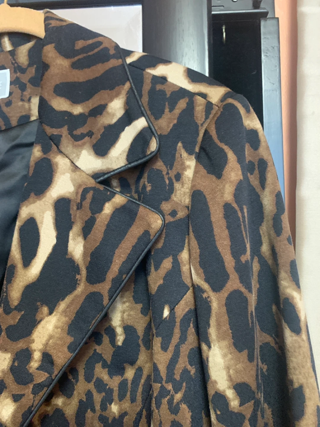 Stylish Guillaume blazer with a bold leopard print. It's fully lined and features two front buttons. Includes an extra button attached inside.