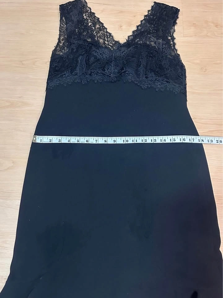Elegant black dress from Rena Lange with a beautiful lace top and sleeveless design. Size 10, made in Slovenia. Bust measures about 16-17 inches flat. Like new!