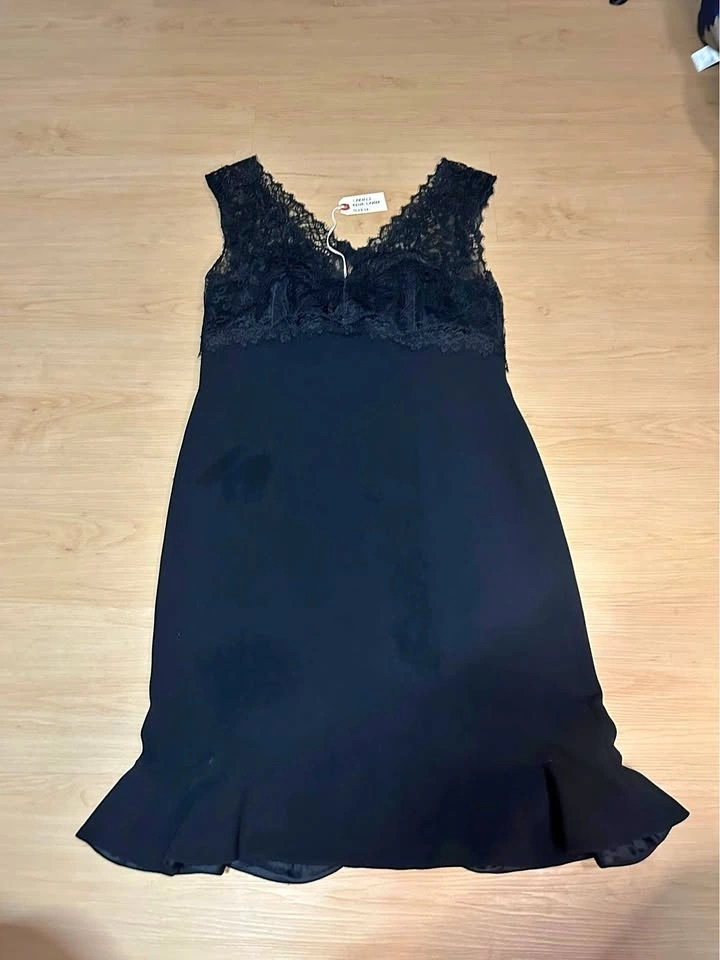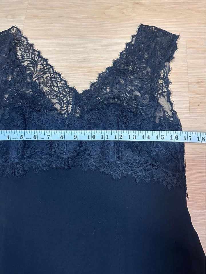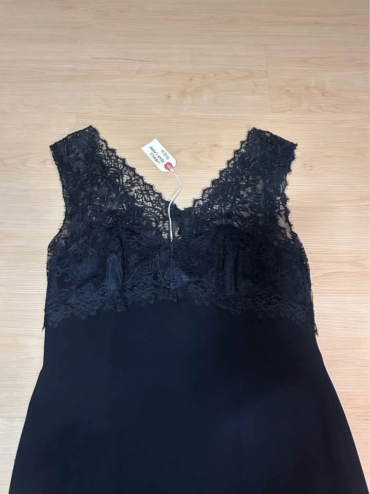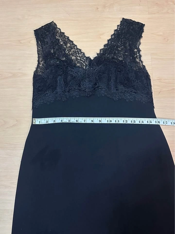 Elegant black dress from Rena Lange with a beautiful lace top and sleeveless design. Size 10, made in Slovenia. Bust measures about 16-17 inches flat. Like new!