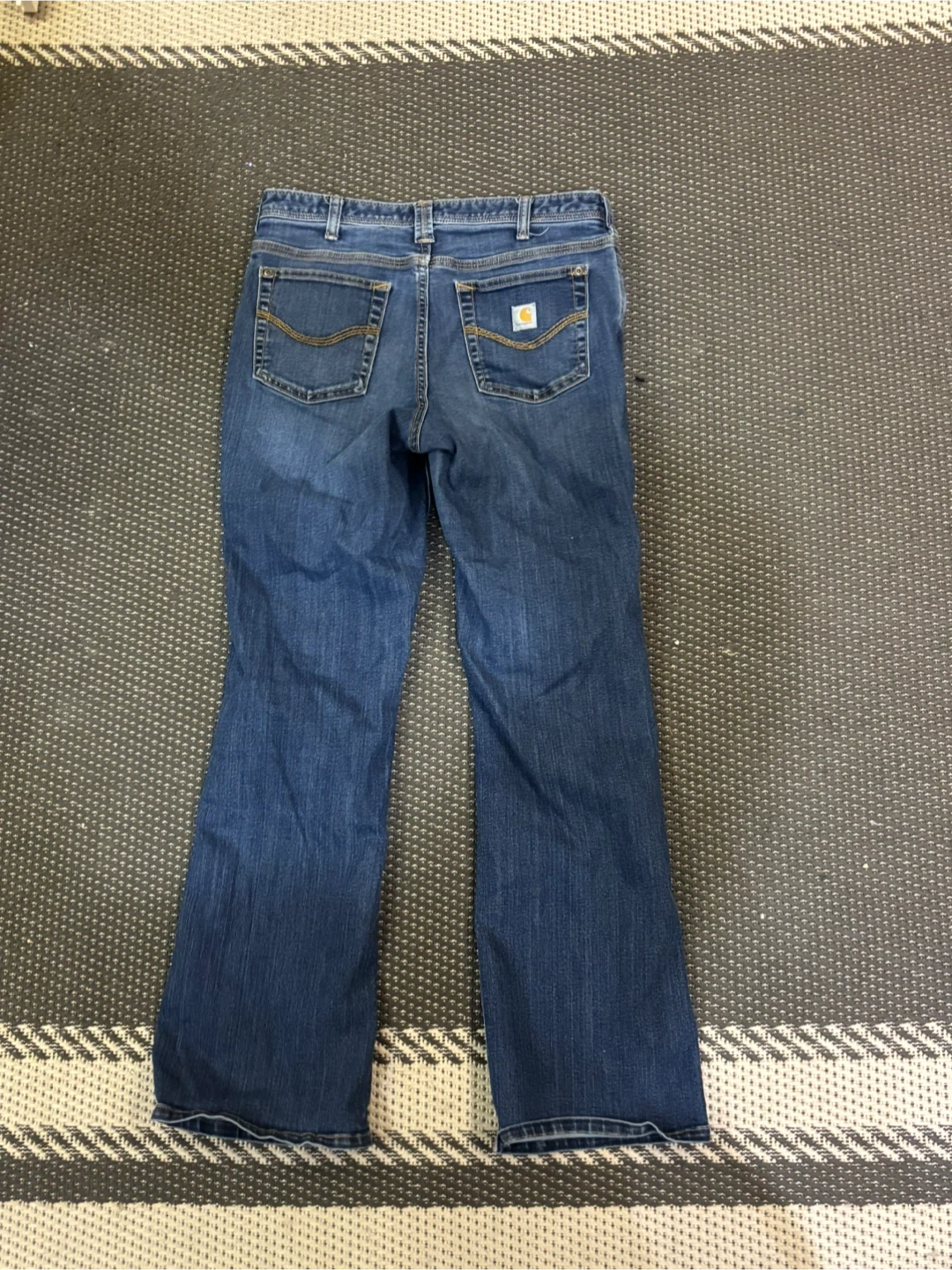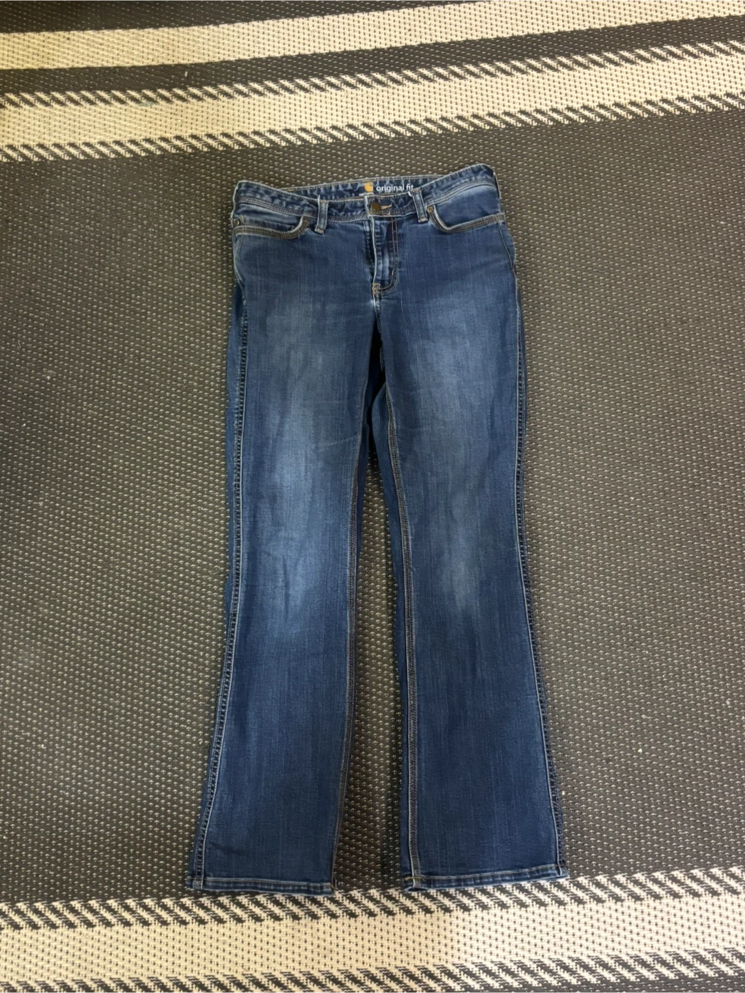 There are 2 different jeans here, the first 2 photos are of the old navy rockstar style jeans they are a size 6. The second pair are carhartt original fit jeans they are a size 6 as well.
