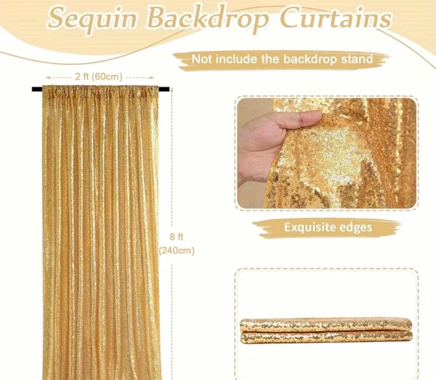 Sparkly gold sequin backdrop curtains. These measure 2 feet wide by 8 feet long. They're perfect for parties, weddings, or photo booths. The backdrop stand is not included.