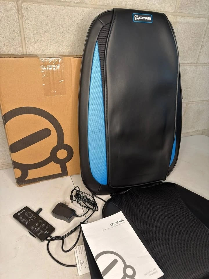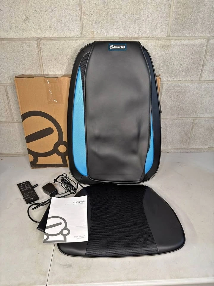 Relax and unwind with this heated back and seat comfort pad featuring adjustable kneading rollers that travel up and down your back to ease tight areas. Choose full, upper, lower, or spot focus, enjoy gentle seat vibration, and secure it to most chairs for home or office use.