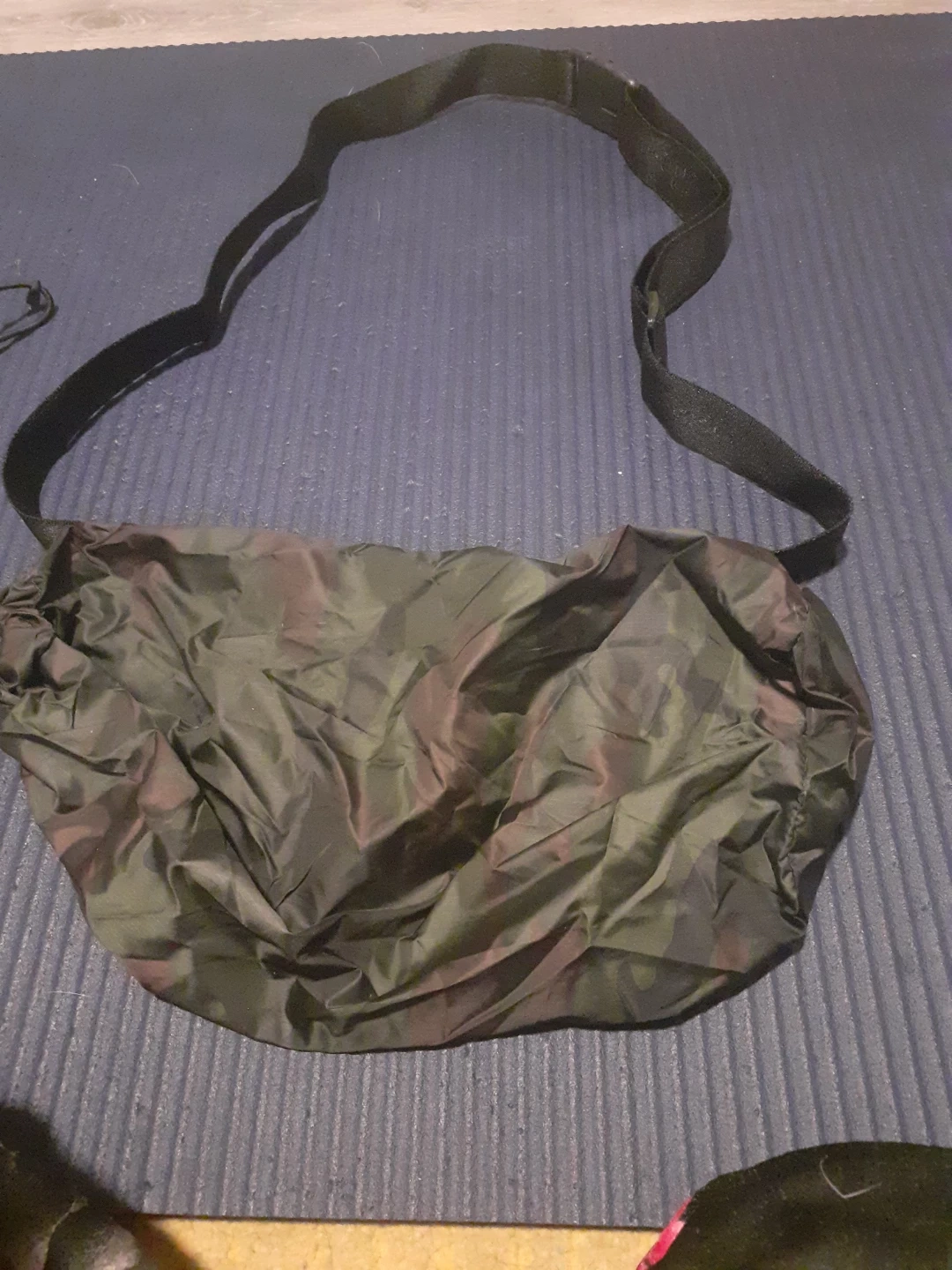 Selling a camouflage shoulder bag. It has a black strap and a drawstring closure. Perfect for carrying small items!