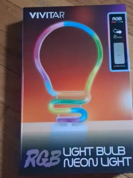 This is a Vivitar RGB neon light shaped like a light bulb. It's a 2-sided light and includes an IR remote. This neon light adds a colorful touch to any room!