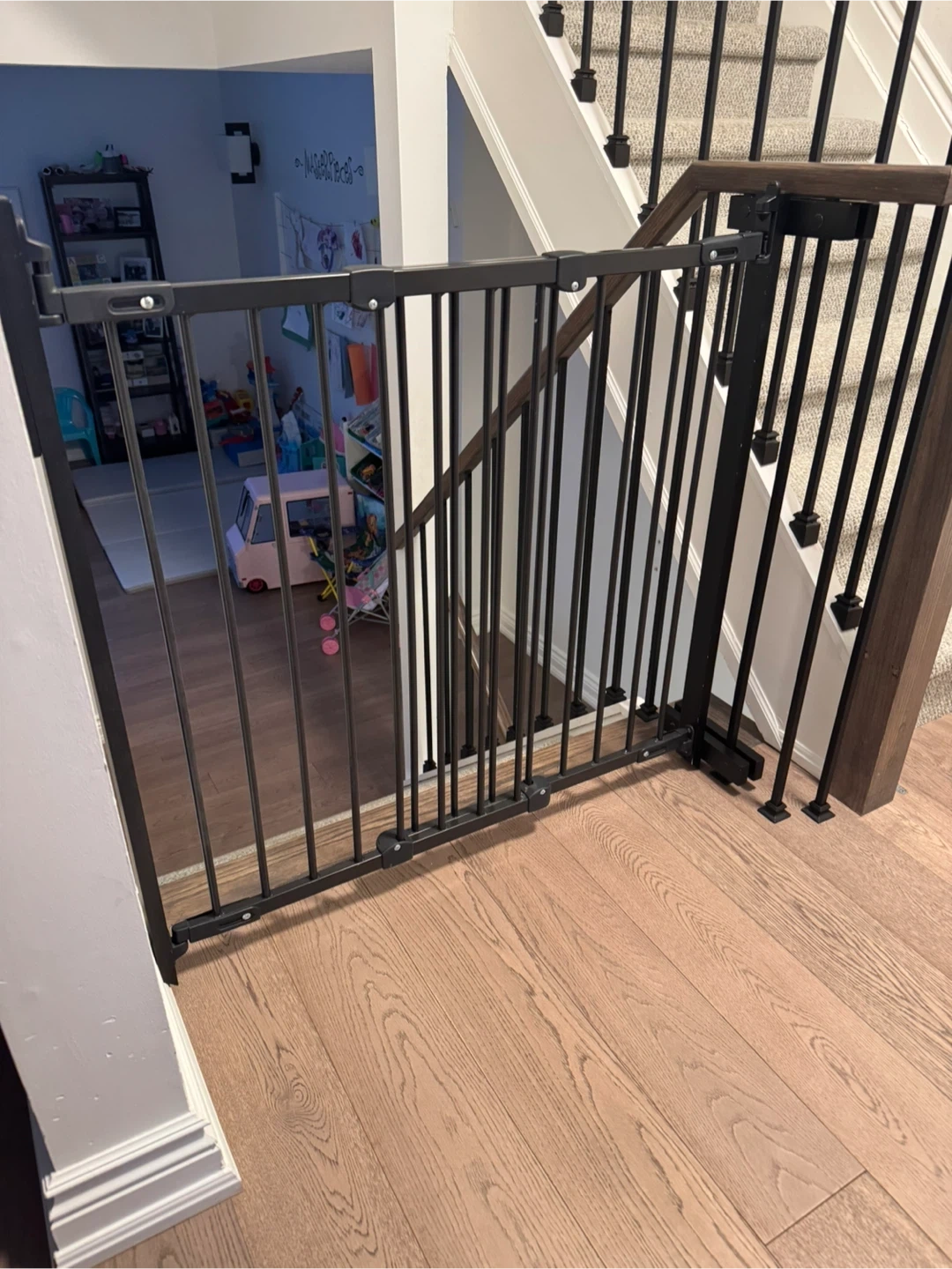 Keep your little ones safe with this sturdy black metal baby gate. It's perfect for doorways or at the top/bottom of stairs. The gate opens and closes easily for convenient access.