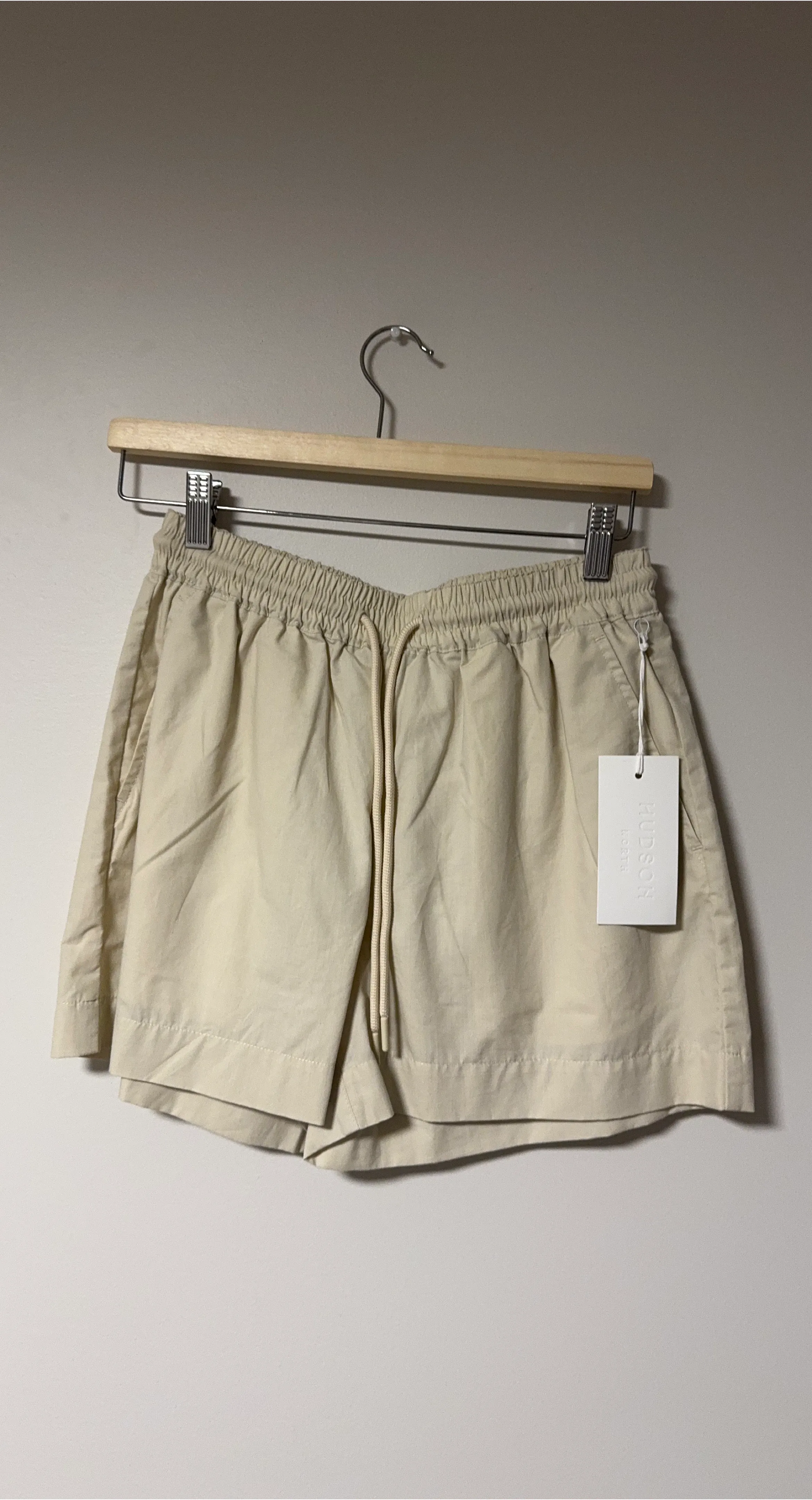 These are beige shorts from HUDSON NORTH. They have an elastic waistband with a drawstring. Made with a cotton blend fabric.