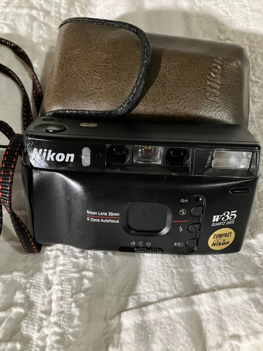 Selling a Nikon W35 Quartz Date compact camera! This sleek black camera features a Nikon Lens 35mm with 5-Zone Autofocus. It comes with its original case.