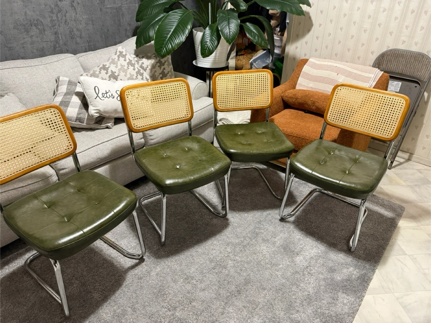 Four dining chairs featuring a vintage design. Each chair has a cane backrest framed in wood and a tufted, green faux leather seat. The frames are made of chrome-plated metal. They're sturdy and ready for a new home!