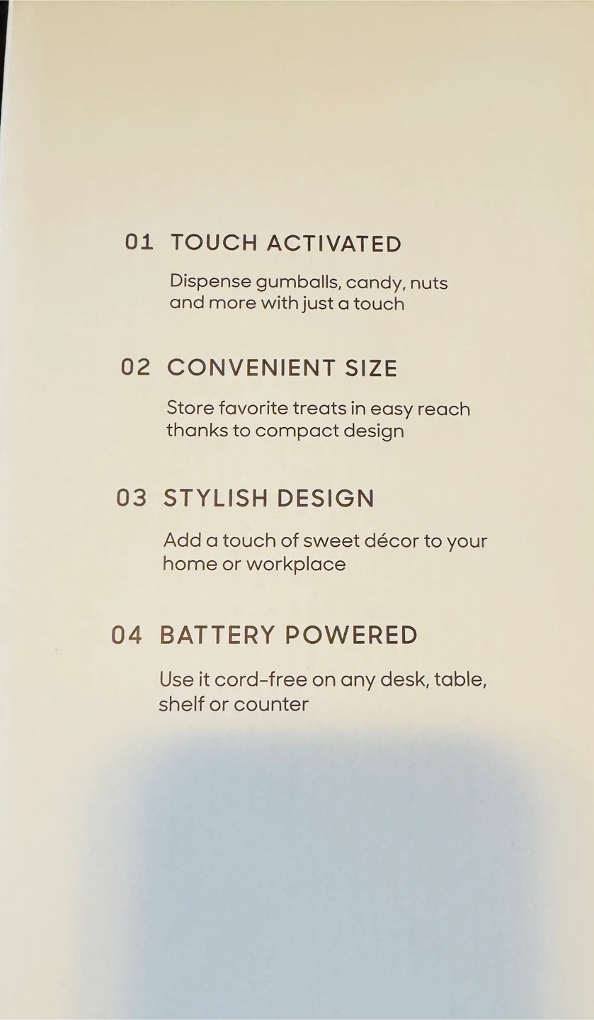 Sharper Image mini candy dispenser. It's touch activated and battery powered, making it easy to use anywhere. Store your favourite treats in this convenient and stylish design.