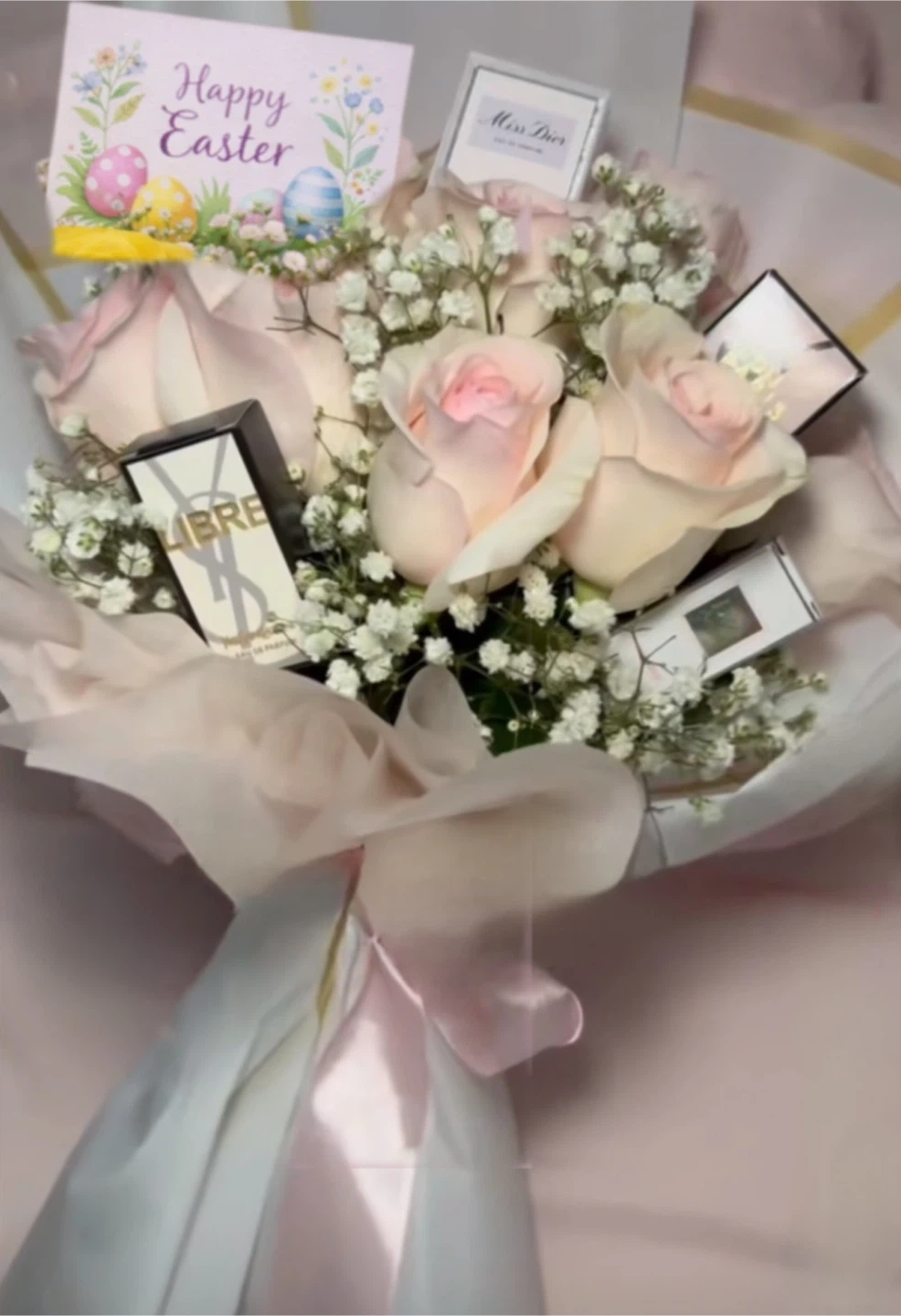 A beautiful bouquet featuring Yves Saint Laurent Libre Eau de Parfum, Channel and Miss Dior perfume.It also includes a Happy Easter card. Perfect for a special gift!