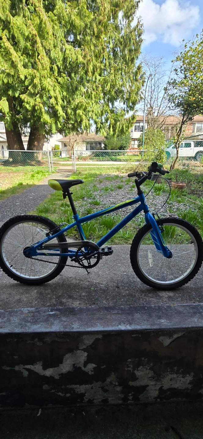 Blue, black and yellow Supercycle bike that comes with a soccer ball bike bell and has 15 - inch wheels. This bike is like new and is great for beginners who are learning to ride a bike