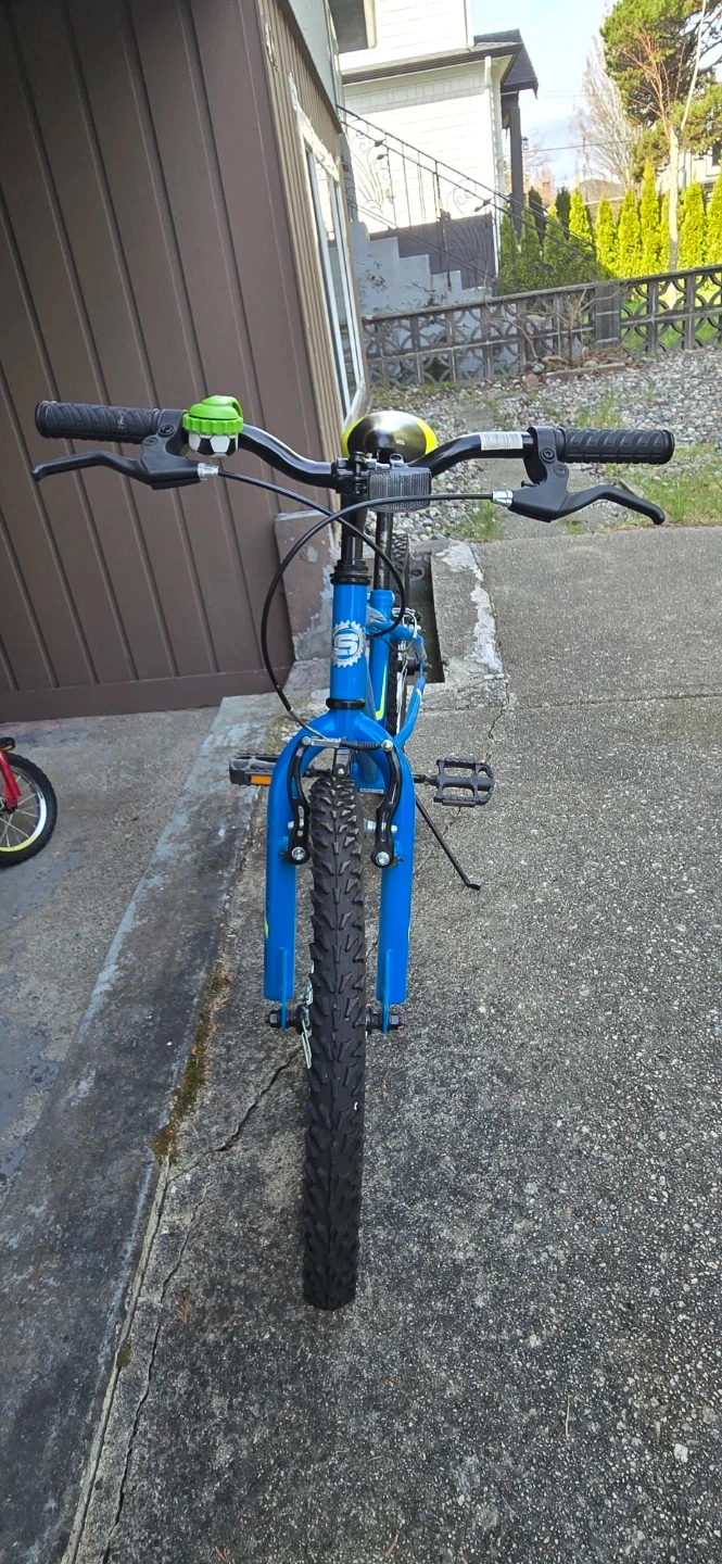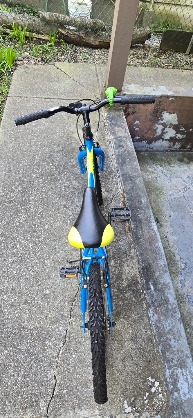 Blue, black and yellow Supercycle bike that comes with a soccer ball bike bell and has 15 - inch wheels. This bike is like new and is great for beginners who are learning to ride a bike