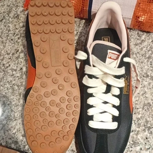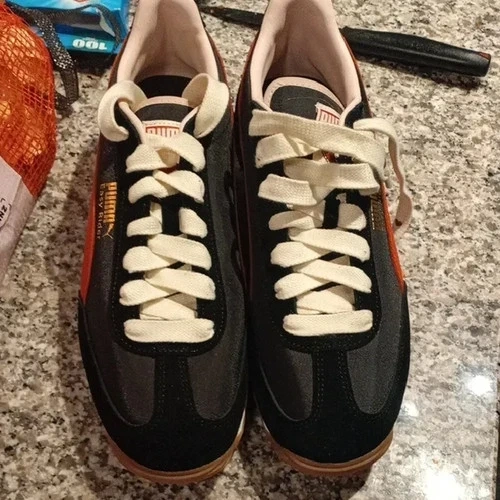 Step up your shoe game with these sleek Puma sneakers, combining both style and comfort. The black and orange colorway adds a bold touch to any outfit, while the white laces provide a sharp contrast, making them a versatile choice for both athletic pursuits and casual wear. Crafted for the modern man, these size 11 sneakers from the PUMA Lace product line feature a supportive fit and durable construction. The lace-up closure ensures a secure feel, whether you're on the move or enjoying a day out. Embrace the blend of performance and fashion with these Puma athletic sneakers.