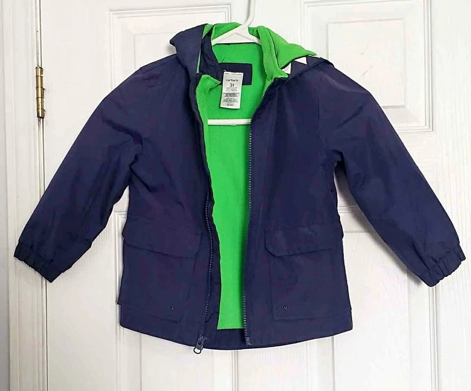 Boys carters dinosaur spring rain coat jacket. Hooded and fleece lined. Size 3t. Cash only, no etransfers. If listing is up, it's available.