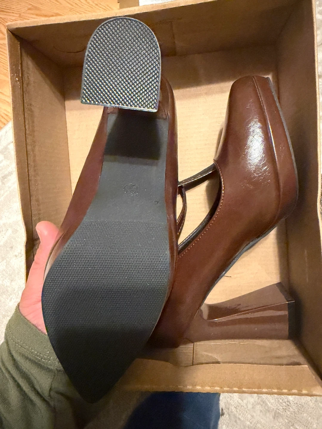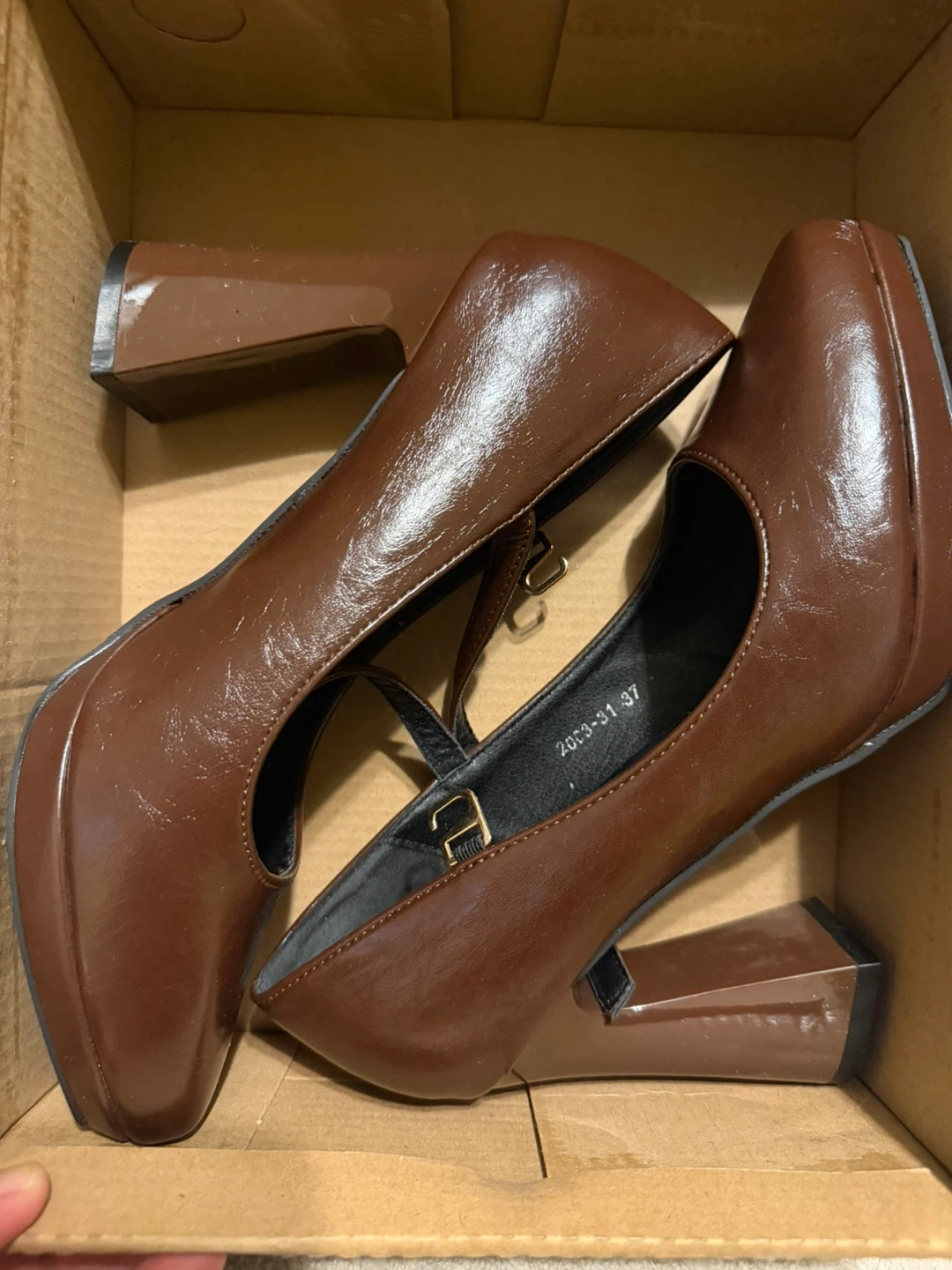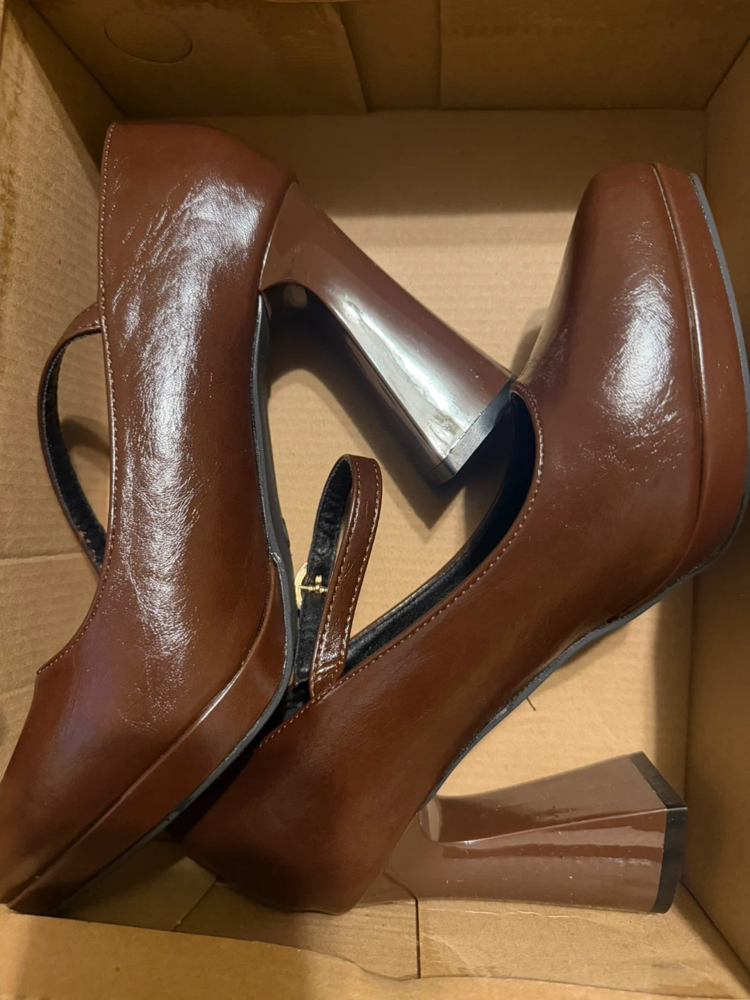 These stylish brown Mary Jane heels feature a chunky platform and a secure ankle strap. The faux leather material gives them a polished look. Size is 37.