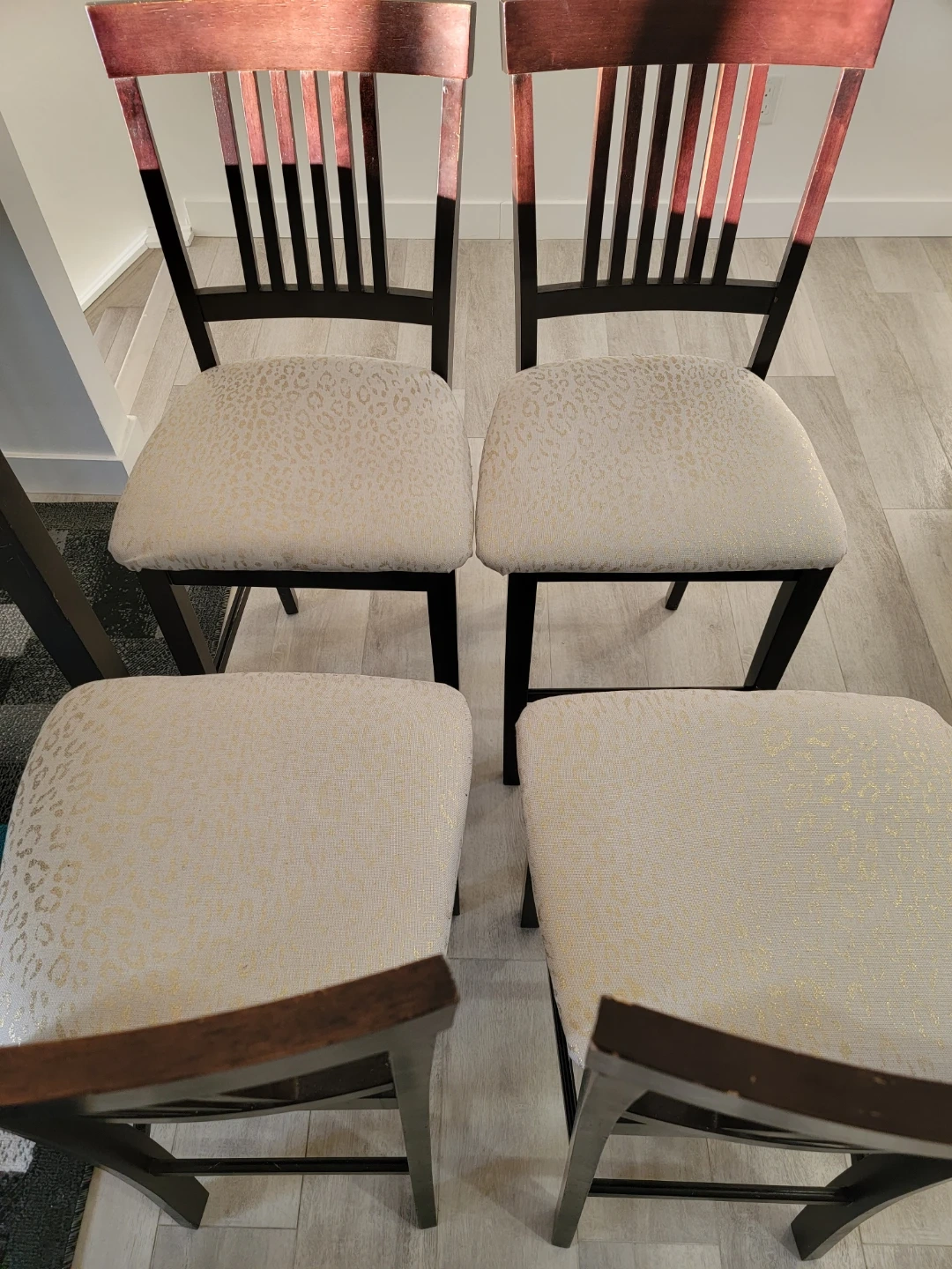 Four counter height chairs with dark wood frames and light-coloured seats featuring a subtle pattern. The seats are padded for comfort. These chairs are suitable for a kitchen island or counter.