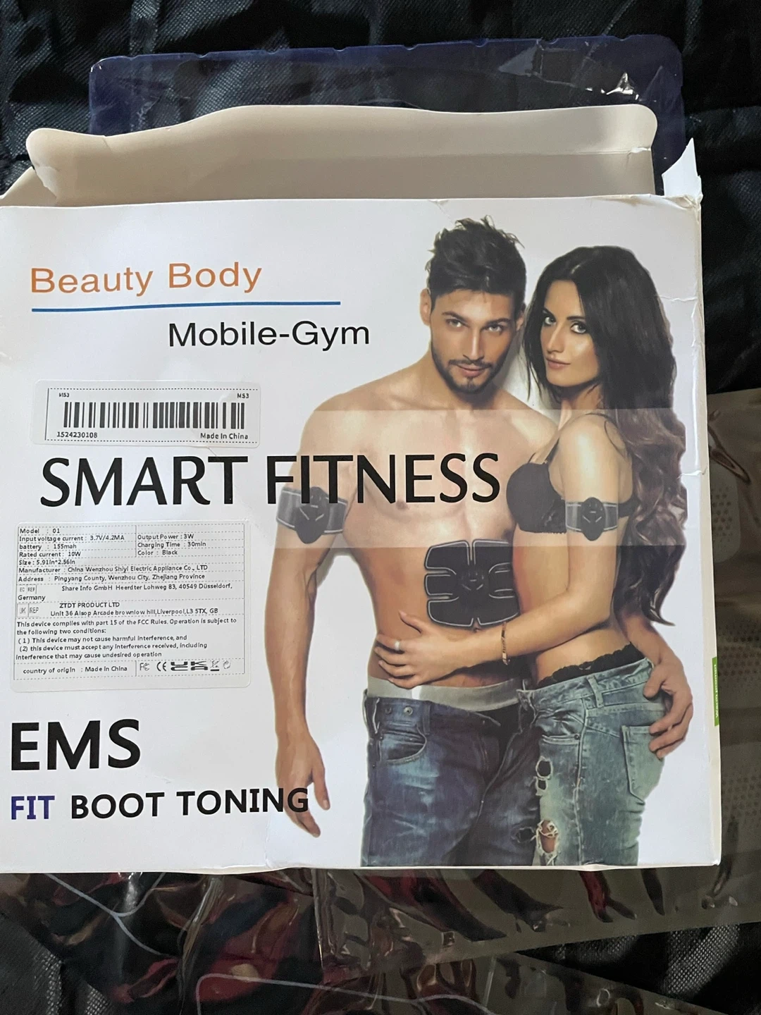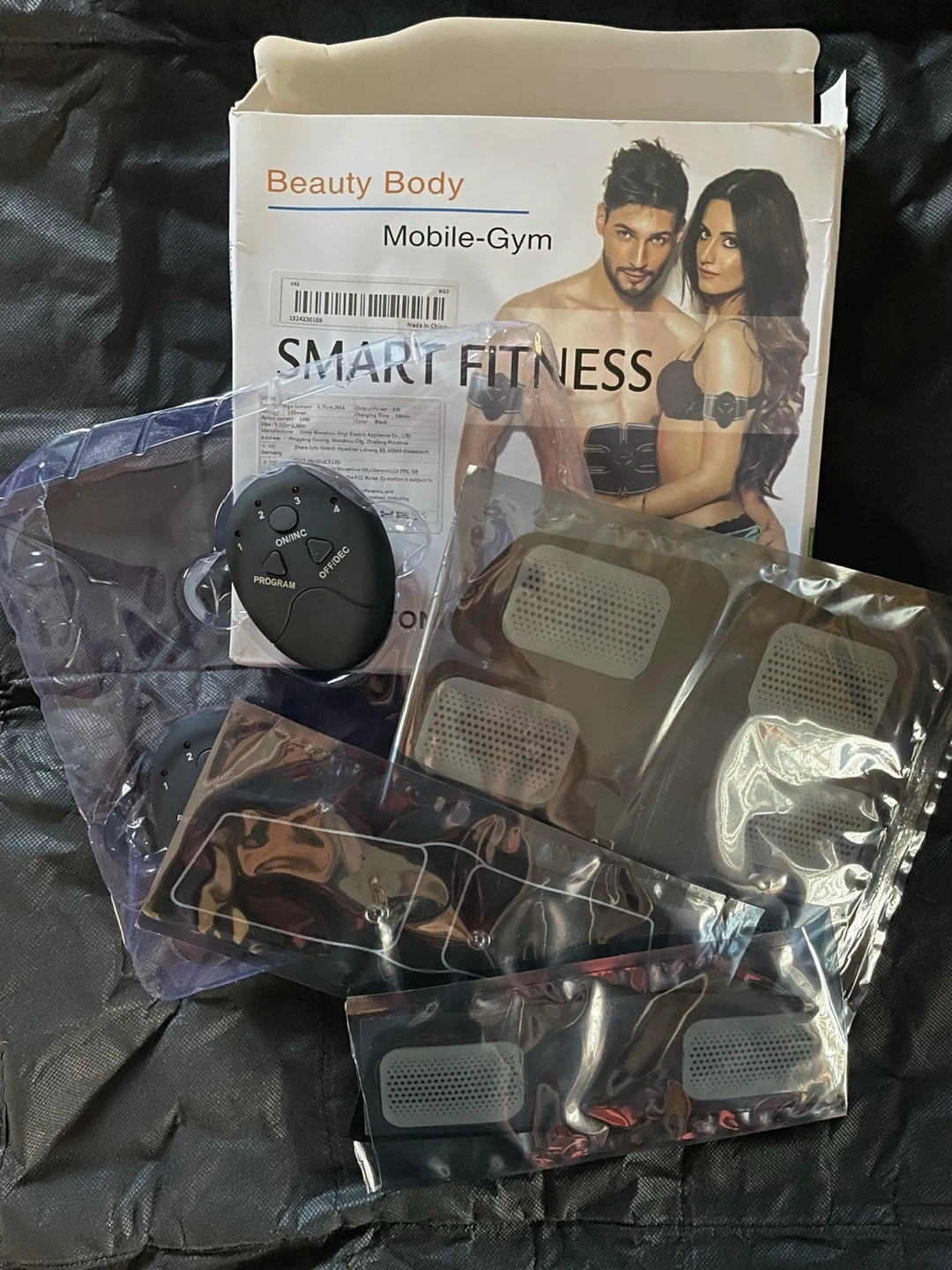 This is a Beauty Body Smart Fitness EMS machine for toning. It comes with multiple gel pads and controllers. The device is designed for abdominal and boot toning. It's easy to use for a quick workout.