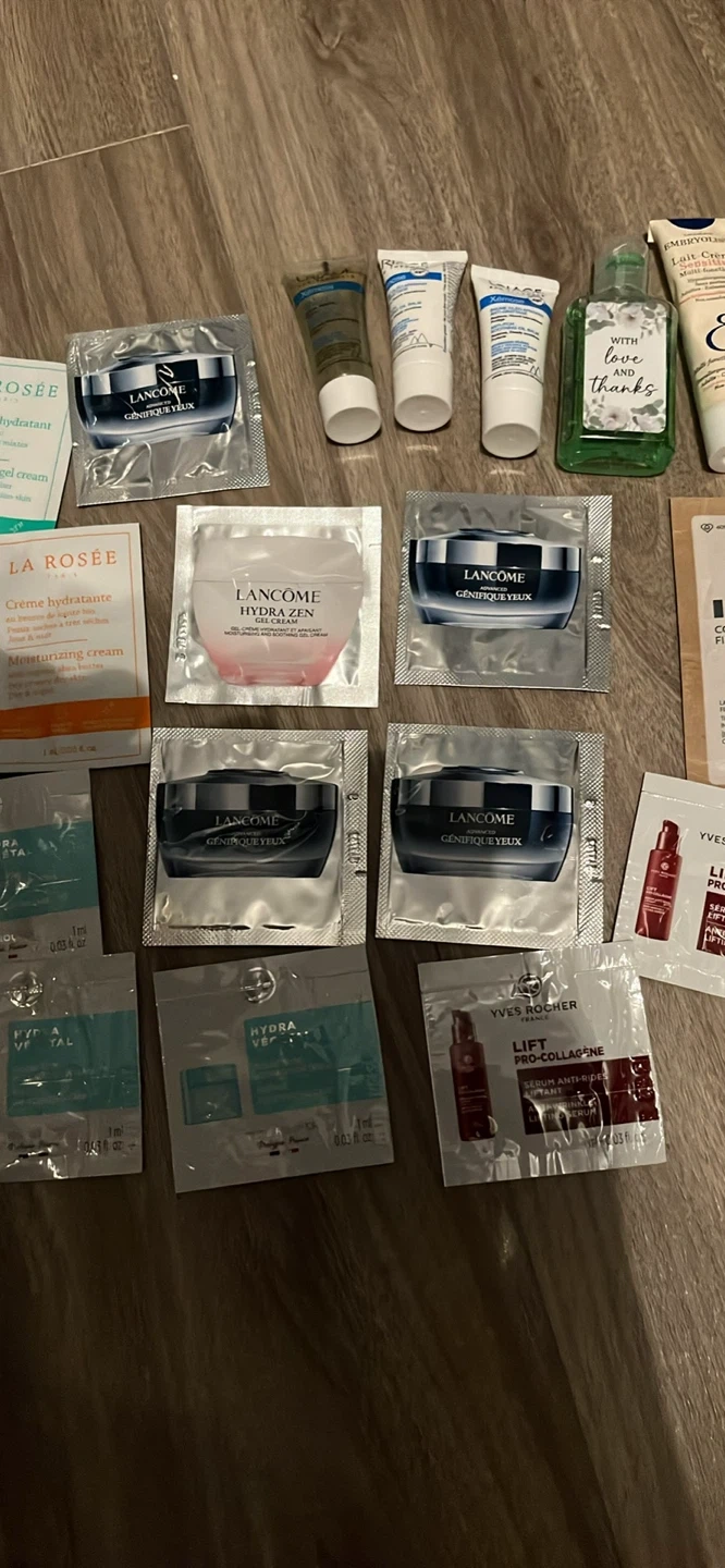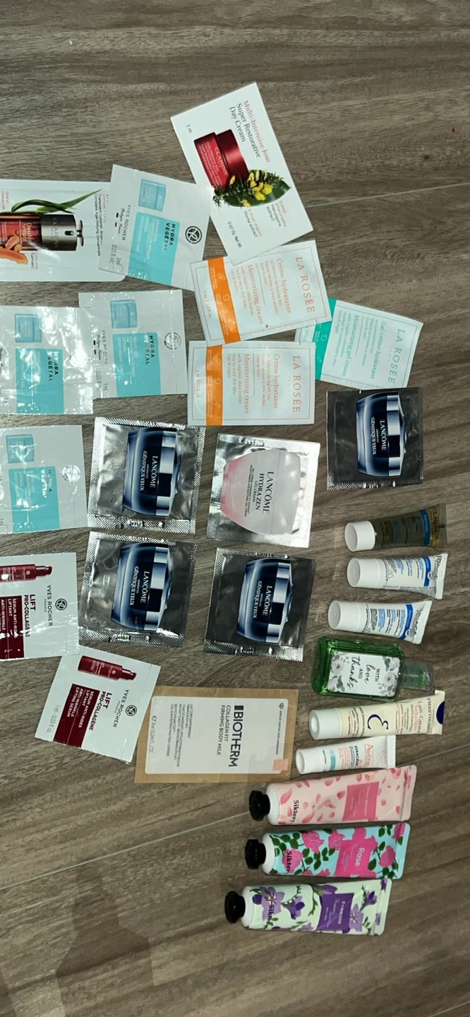 A collection of various skincare samples. Includes items from brands like Lancôme, Biotherm, La Rosée, and Yves Rocher. Perfect for trying out different products. Open to all offers just want good