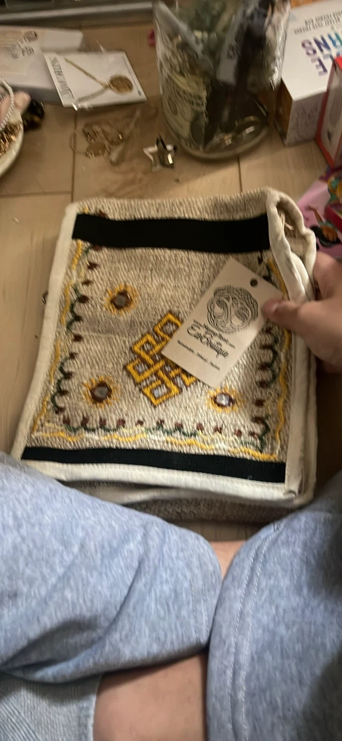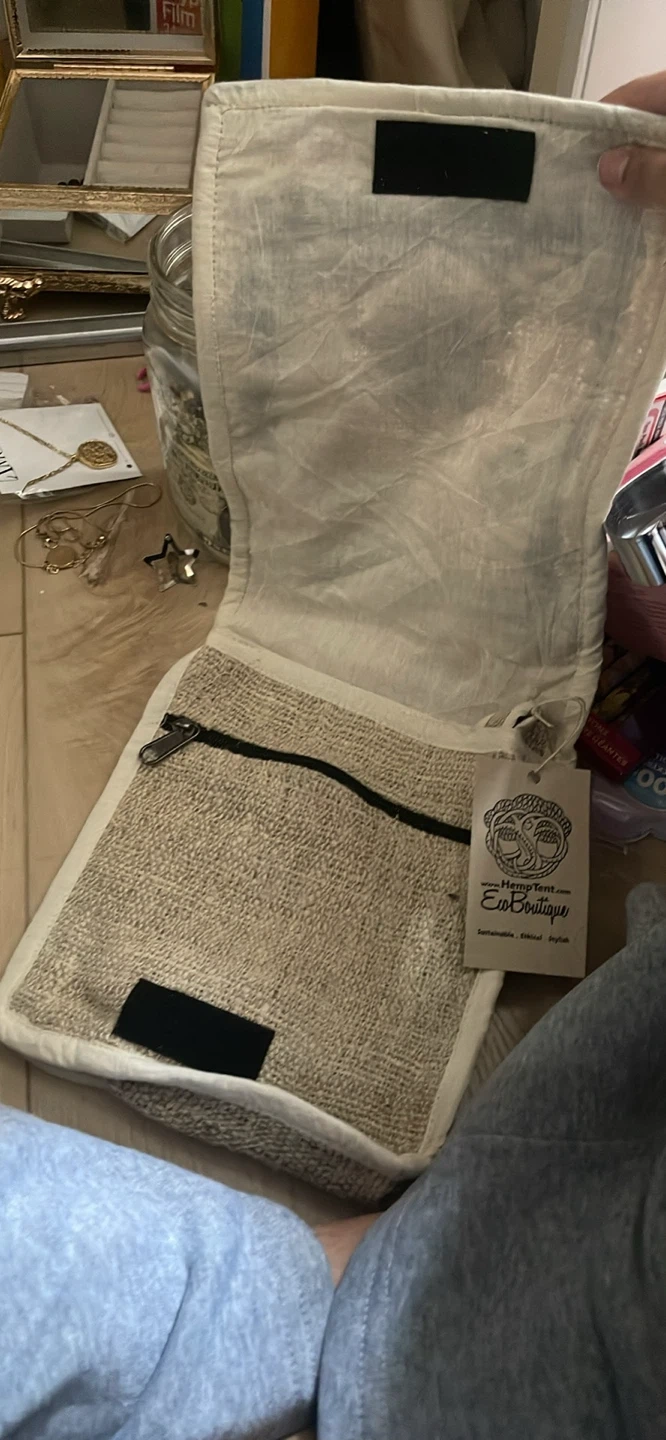 This HempTant EcoBoutique messenger bag is crafted from natural hemp material. It features embroidered detailing and a secure zipper pocket inside. It's perfect for carrying essentials on the go!