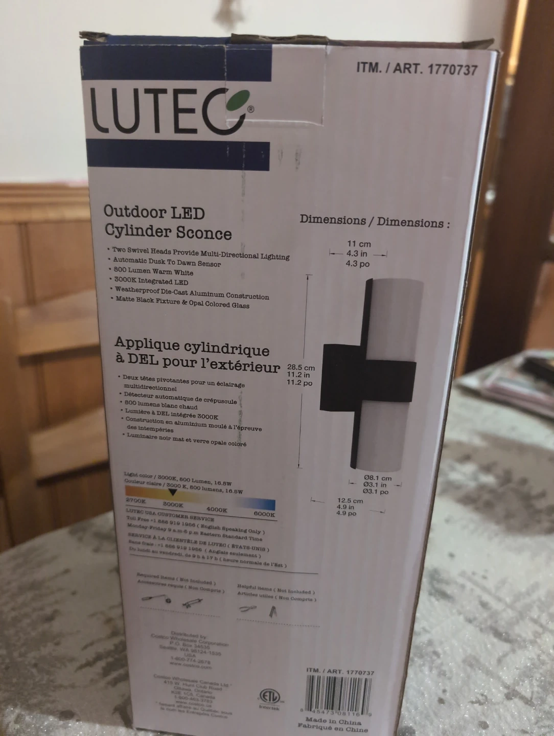 This Lutec outdoor LED cylinder sconce offers two swivel heads for multi-directional lighting. It features 3000K integrated LED with a matte black fixture and opal coloured glass. Dimensions are 11 cm x 4.3 cm x 11.2 cm.