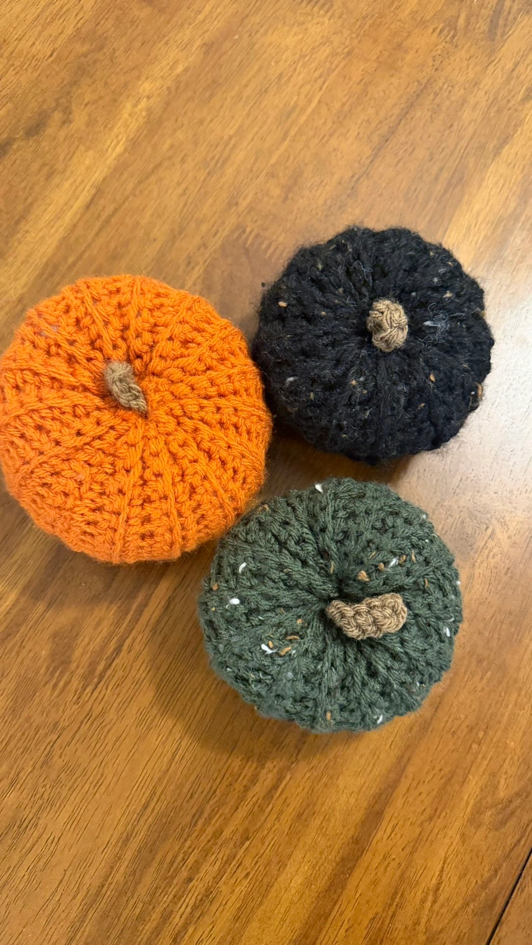 Soft knit pumpkins in orange, black, and green. Approx. 4–5” wide x 3” tall each. Perfect for fall décor, shelves, tiered trays, or table styling. Great condition. Selling as a set.