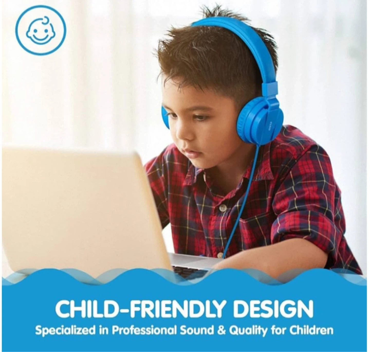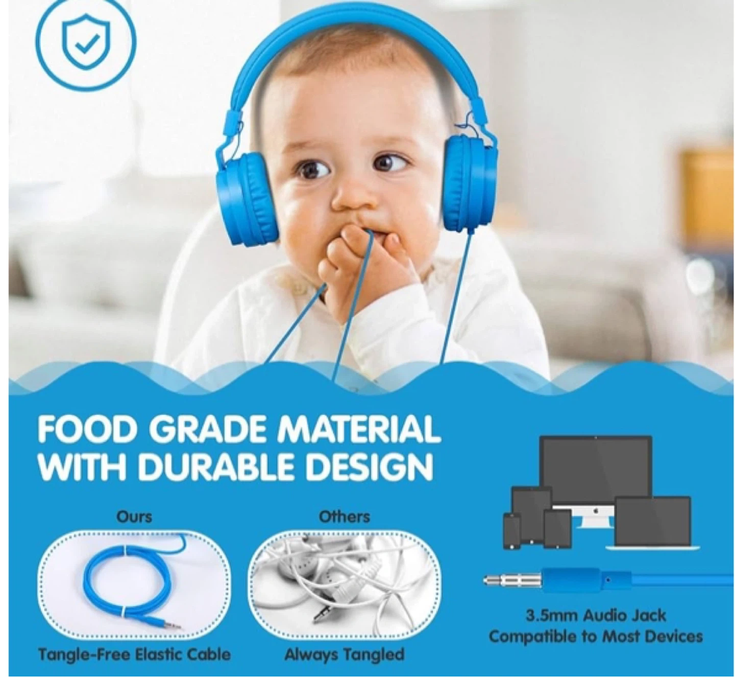 These ONTA headphones are designed for kids with a comfortable, adjustable fit and leather ear pads. They feature a tangle-free elastic cable and a 3.5mm audio jack compatible with most devices. Built with food-grade material for durability!