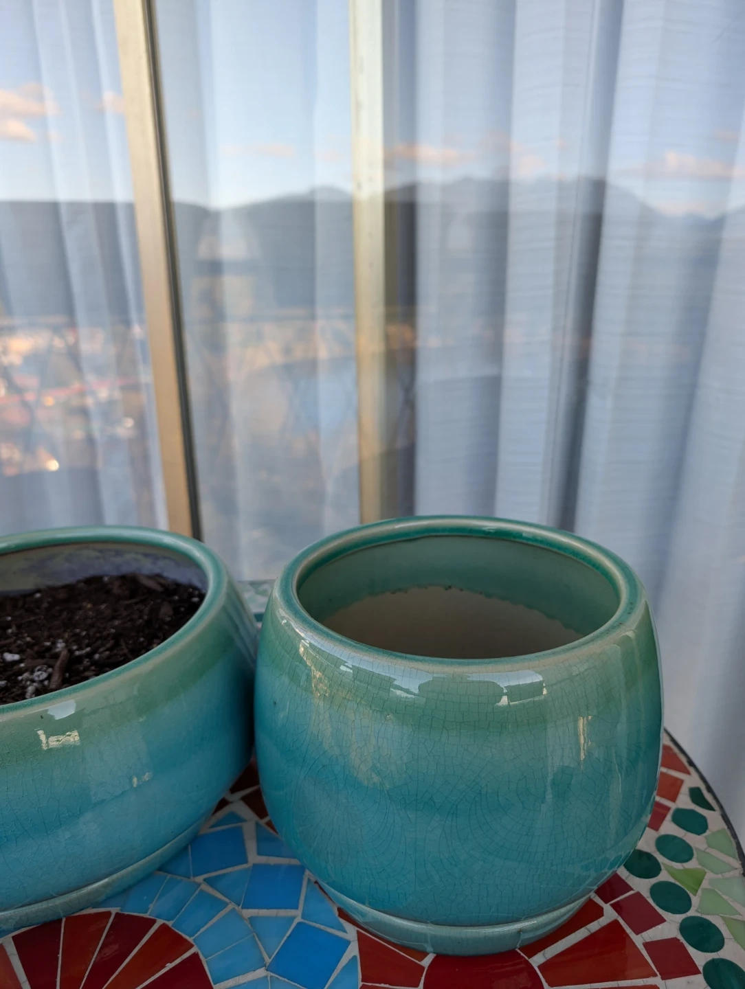 Two turquoise/green ceramic planters with a crackle glaze finish.