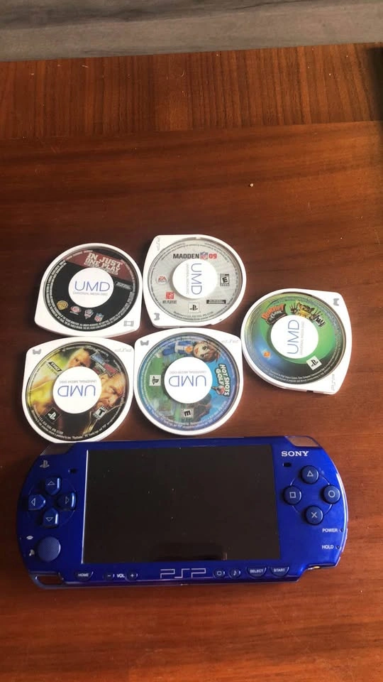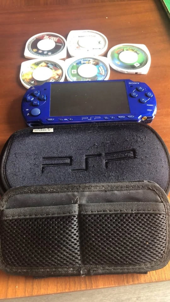 0PSP royal blue Madden 09 edition. Comes with case, power cord, memory stick, 4 games (including M09) and game travel pouch.