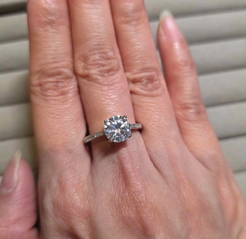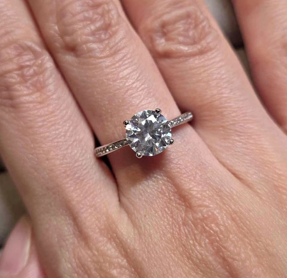 Brand new 2 carat Moissanite ring with a pave band. Features D Color, VVS Clarity, and is made of Sterling Silver. It's hypoallergenic and has an adjustable band. Diamond tester passed. Sparkles like a diamond — perfect for everyday luxury, bridal gifts, or timeless elegance. Pickup in East Vancouver.