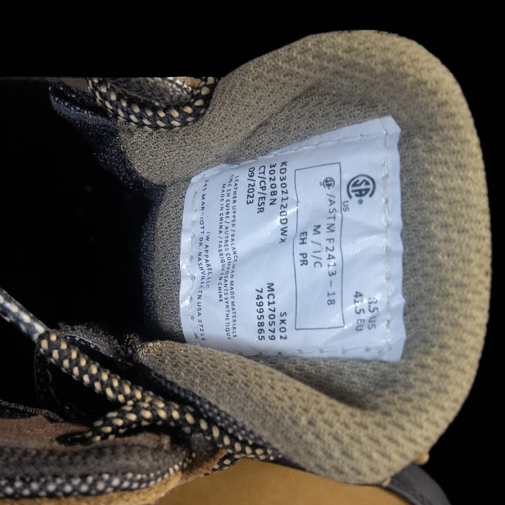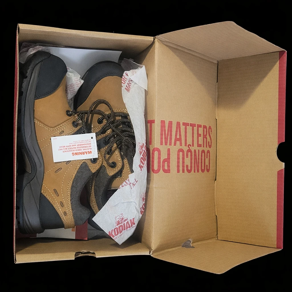 These Kodiak work shoes are made with a leather upper. They have a brown colour and are size 8.5 US Men's / 41.5 EU.