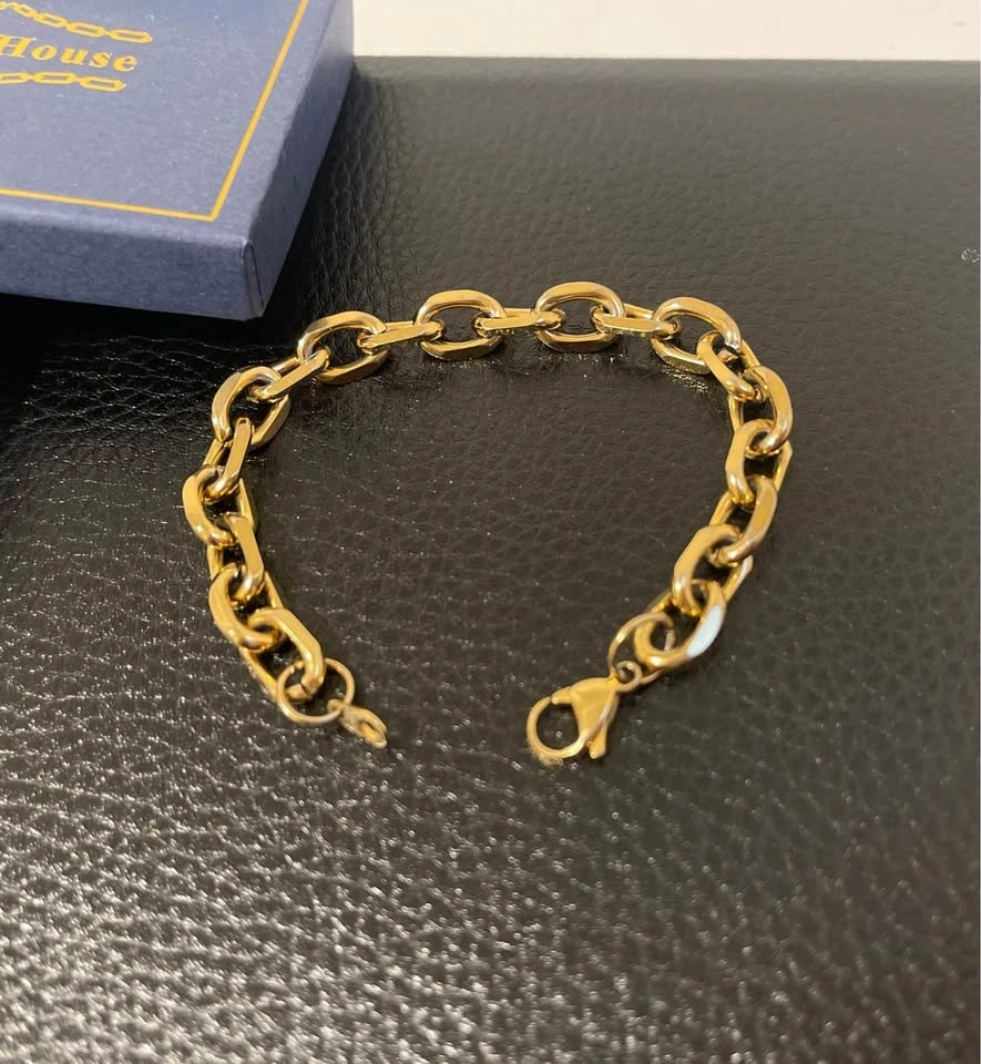 Polished gold-toned stainless steel chain bracelet from ChainsHouse. This piece is 7.5 inches long with a 9mm width. It has a secure lobster claw clasp and comes with the original blue brand box and black drawstring pouch.
