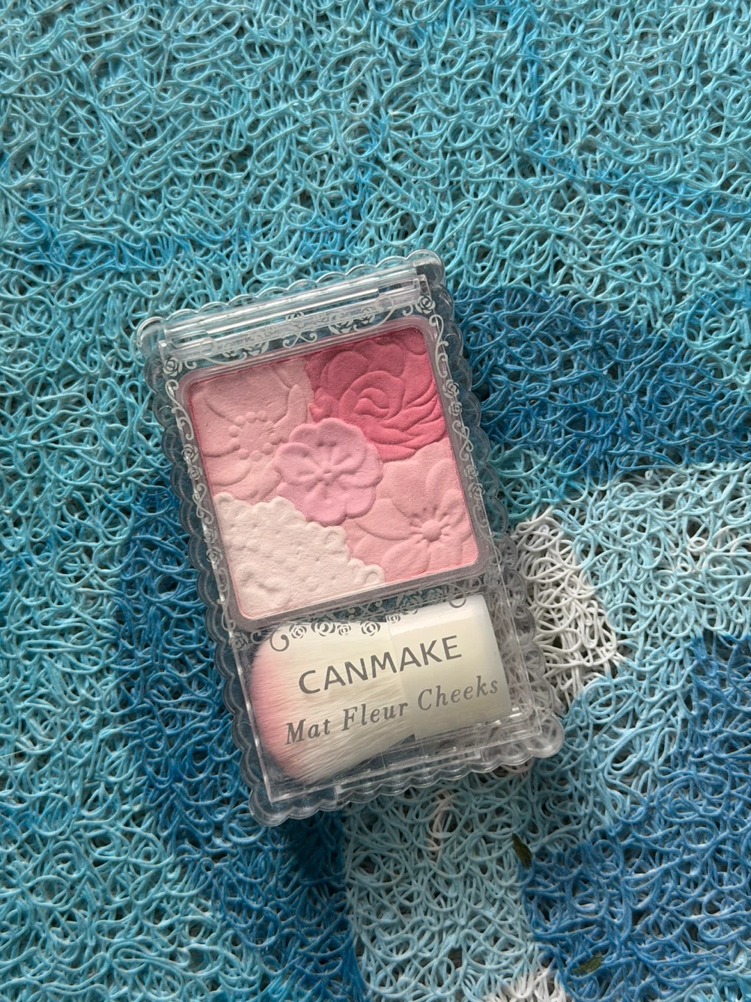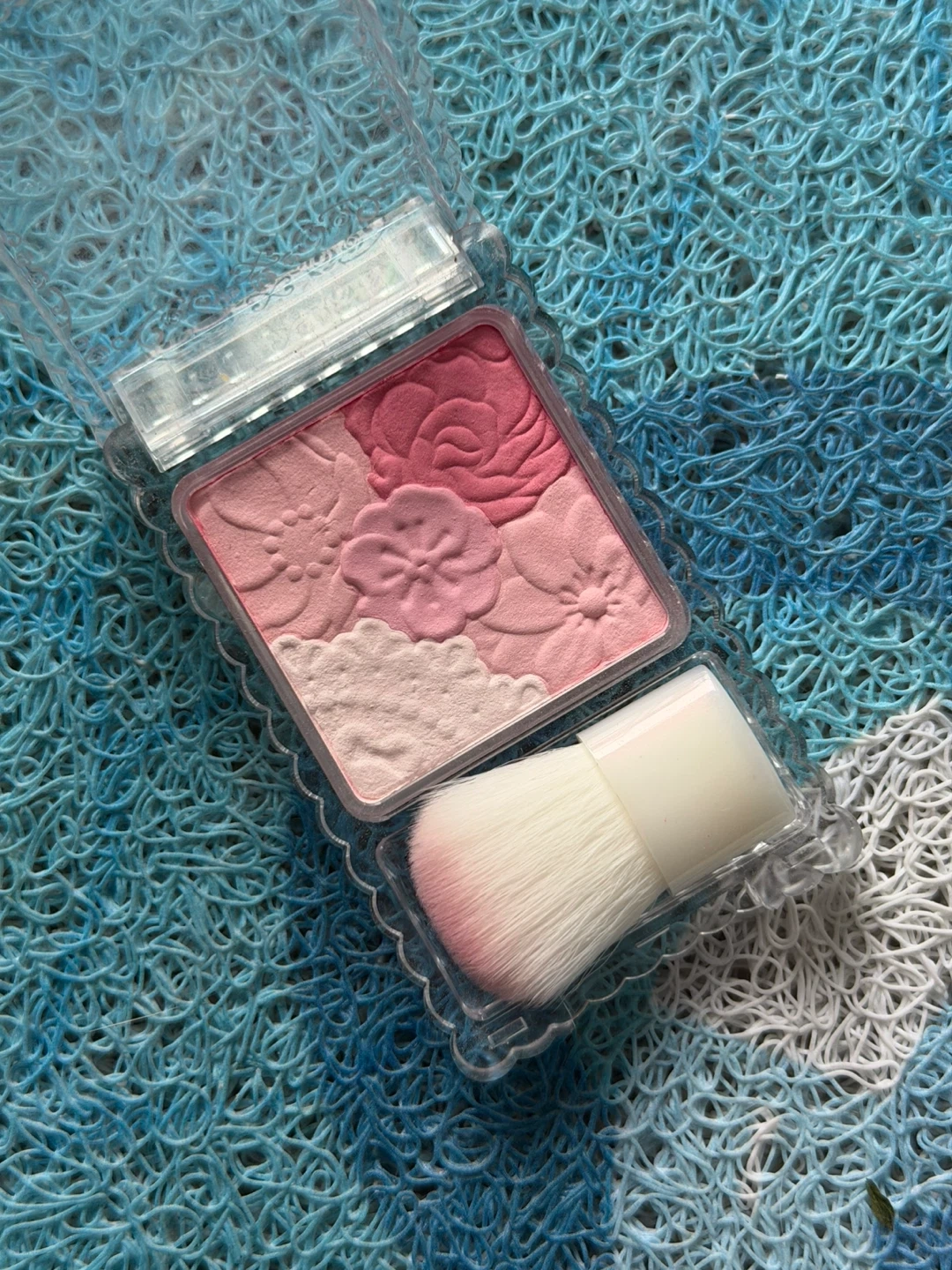 This is a CANMAKE Glow Fleur Cheeks blush. It features a beautiful floral embossed design. Includes a soft application brush.