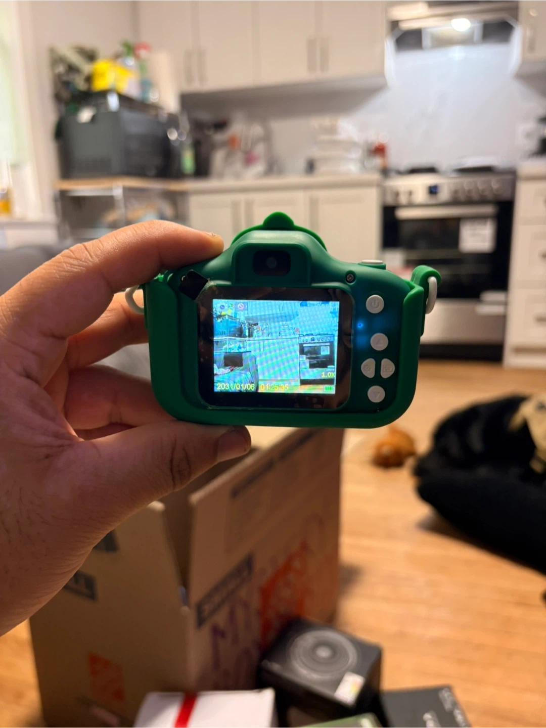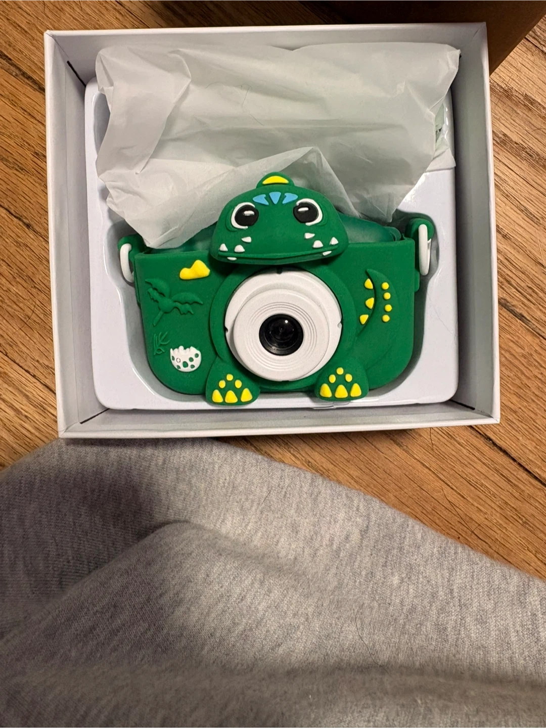 This is a fun green kids camera shaped like a dinosaur. It's designed for children and comes in its original box. This camera is great for sparking creativity in little ones! With 1080P resolution and stunning pictures that your child can take.